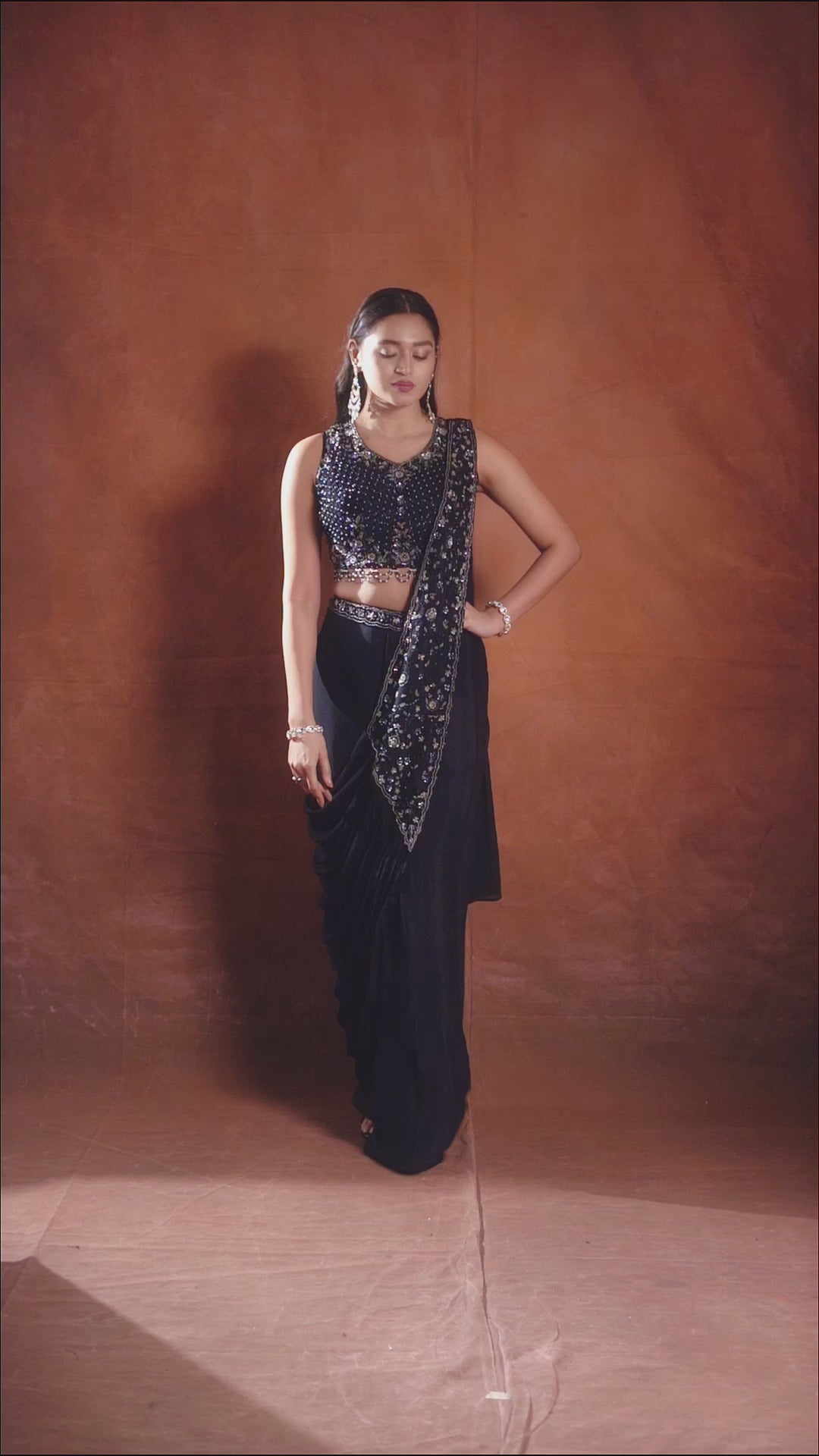 Dark Grey Embellished Chinon Silk Drape Skirt Set
