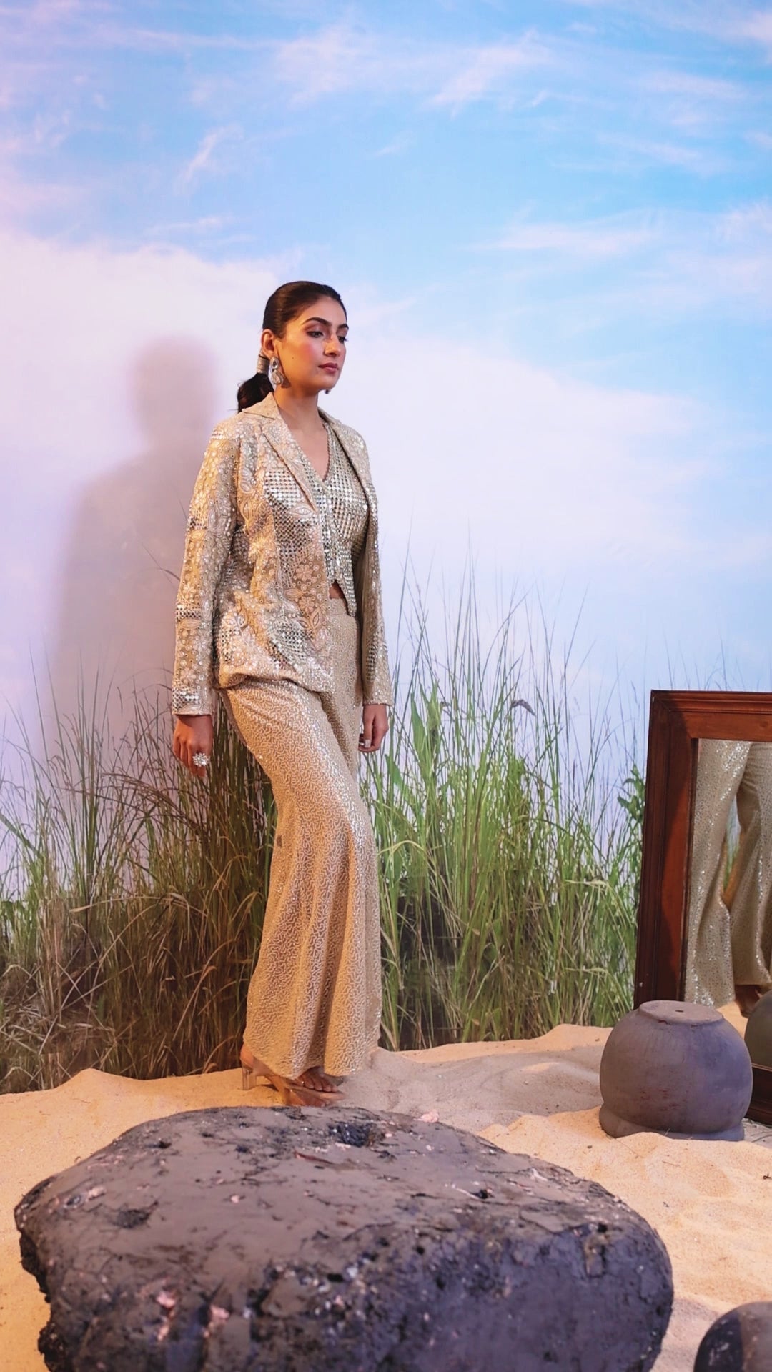Champagne Gold Embellished Premium Net Jacket Palazzo Set