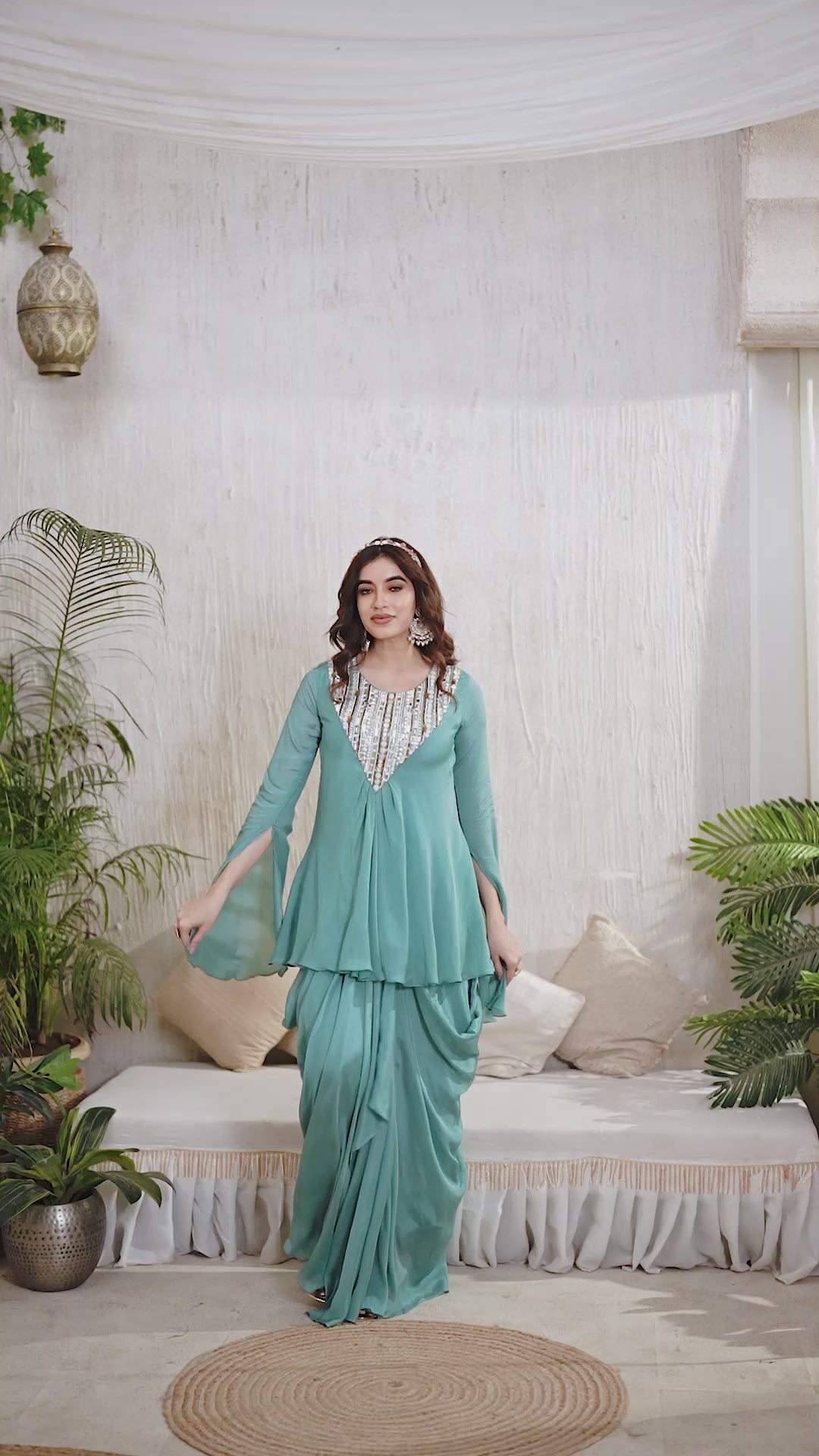 Pastel Green Embellished Chinon Silk Drape Skirt Set