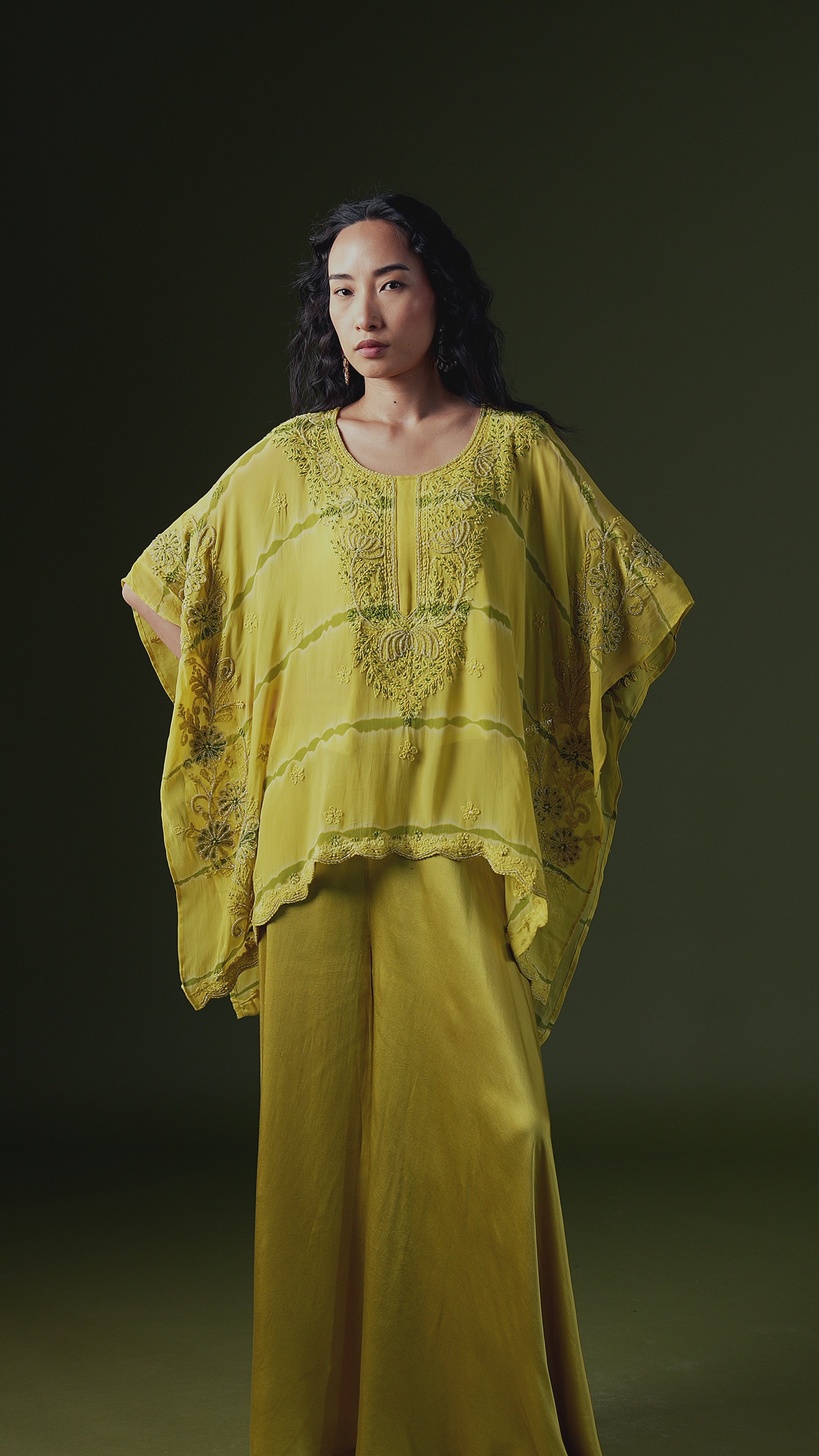 Lime Green Embroidered Georgette Silk Kaftan Set