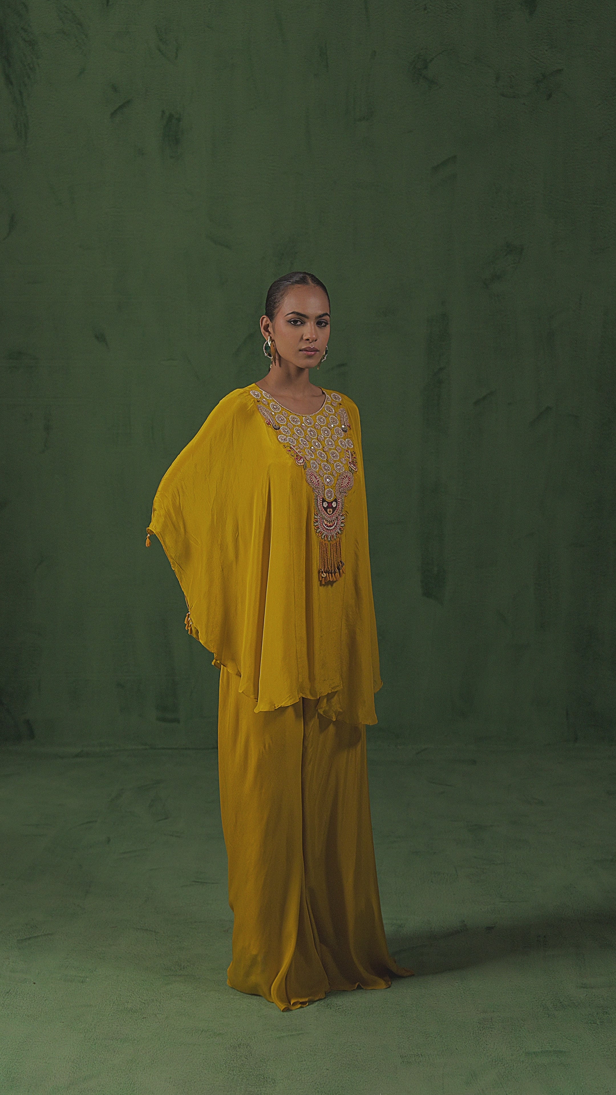Mustard Yellow Embellished Chinon Silk Kaftan Set