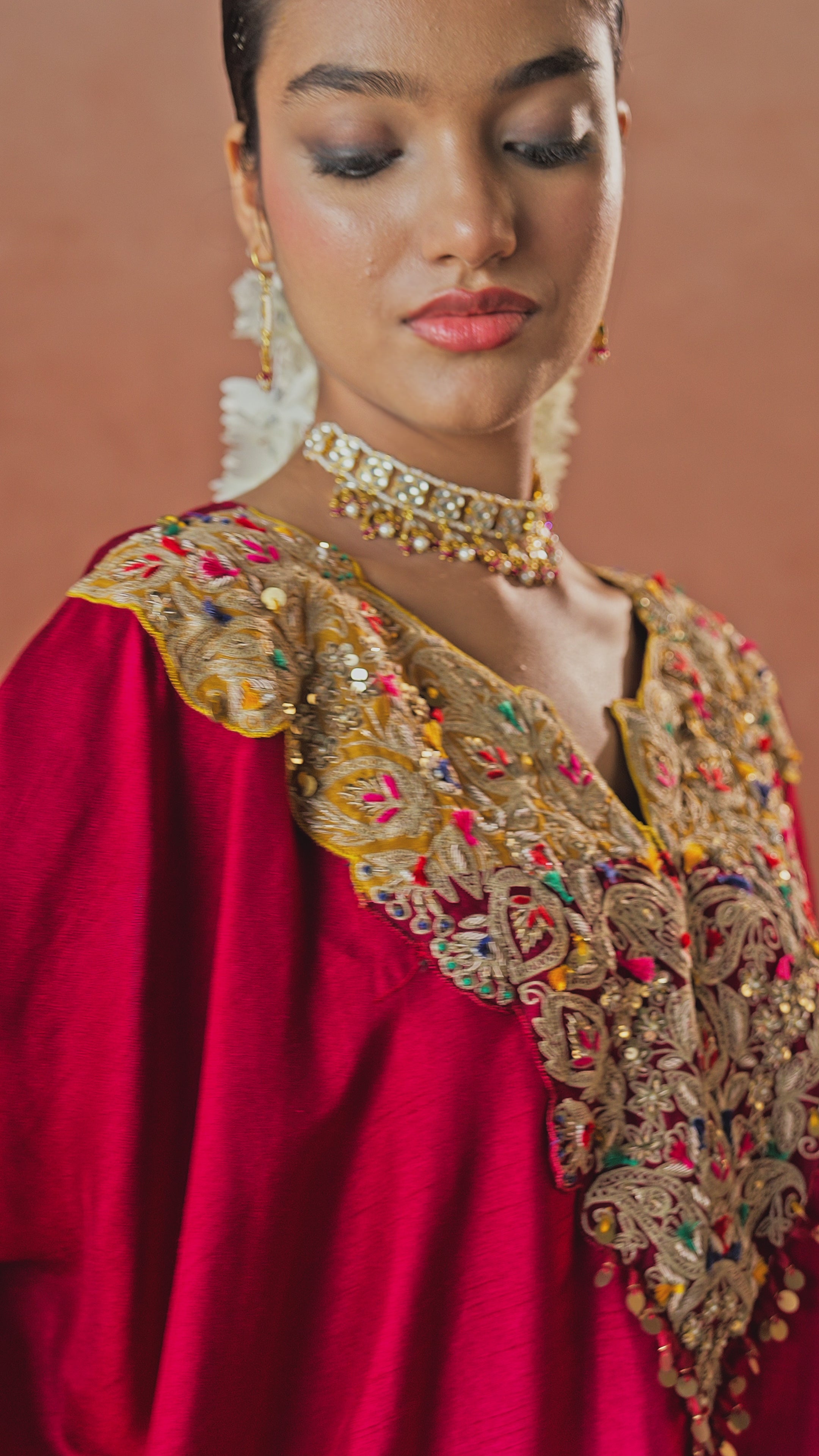 Deep Red Embroidered Organza Silk Kaftan Set