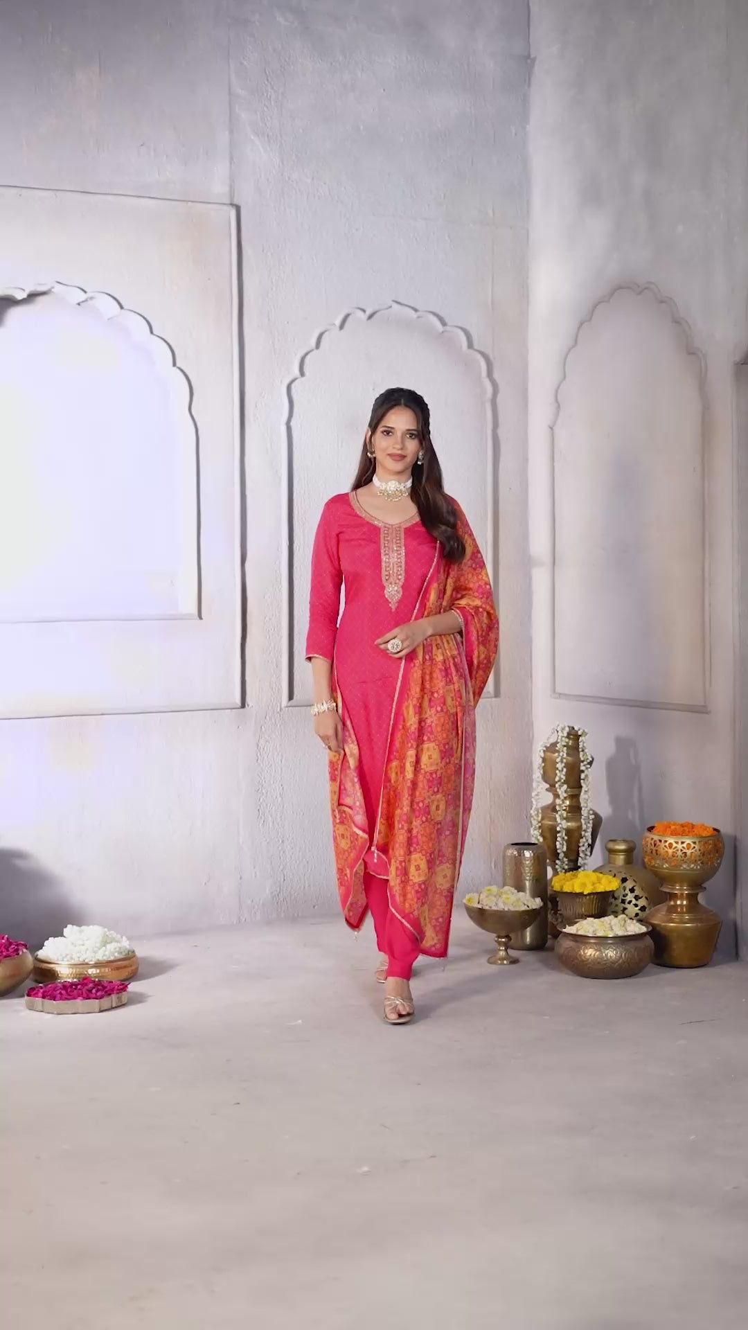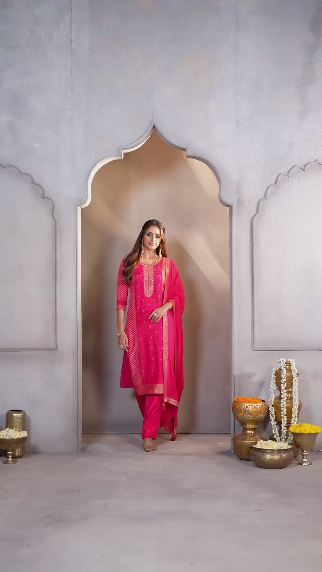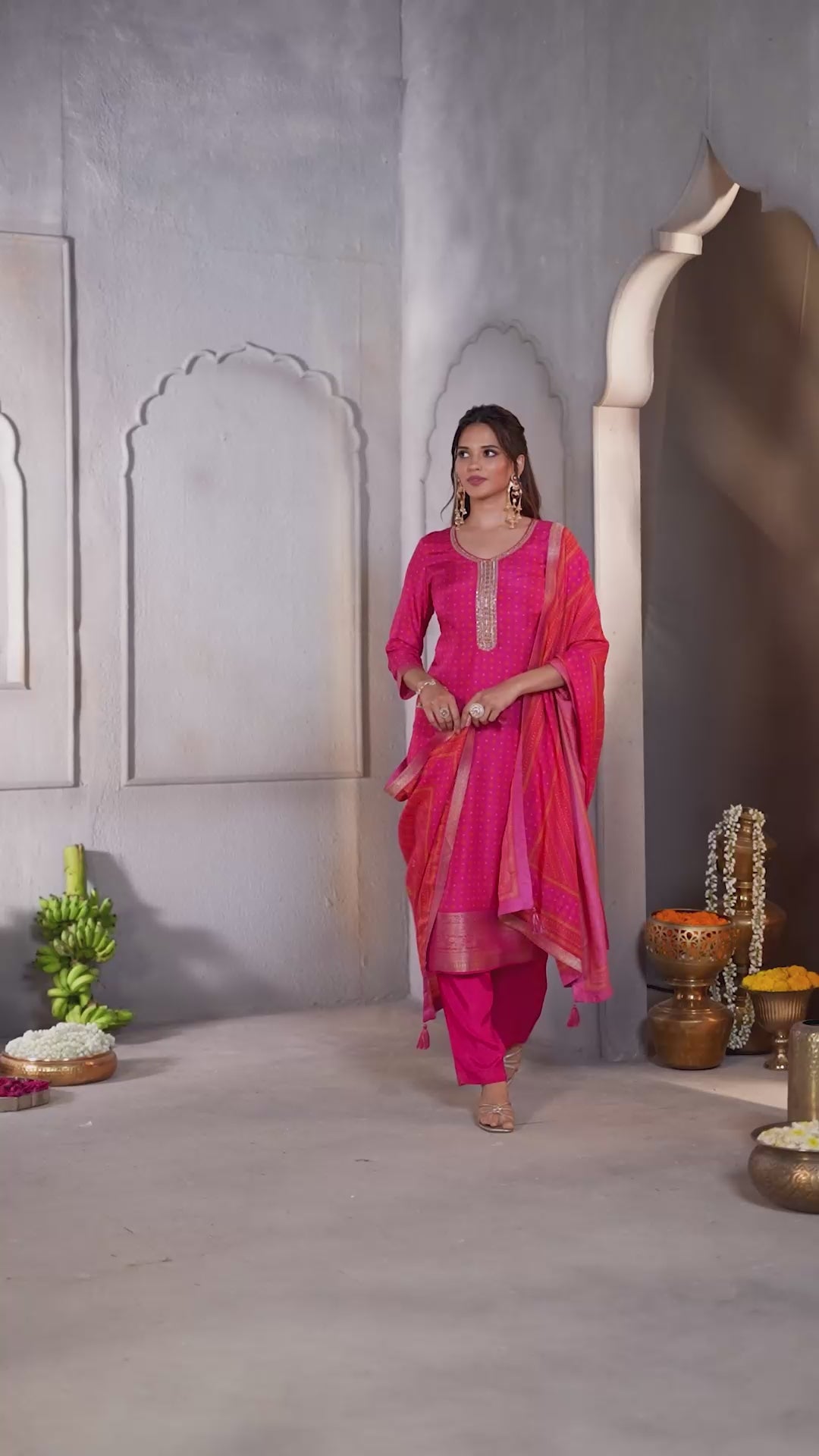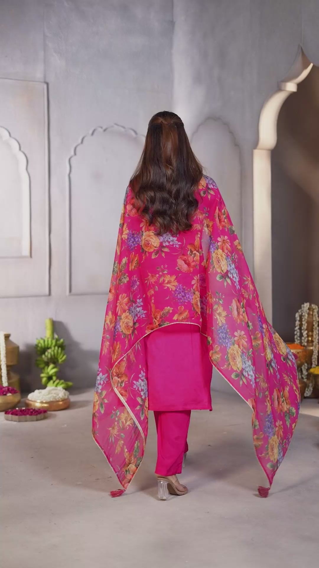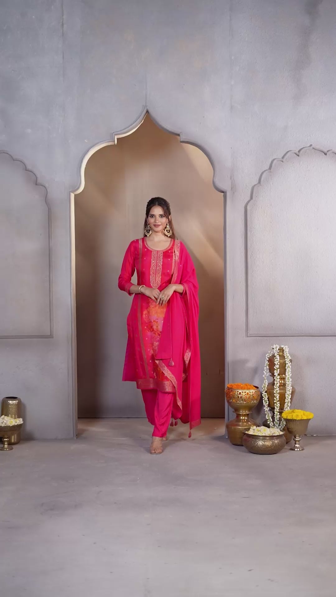 Vibrant Pink Printed Dola Silk Pant Set