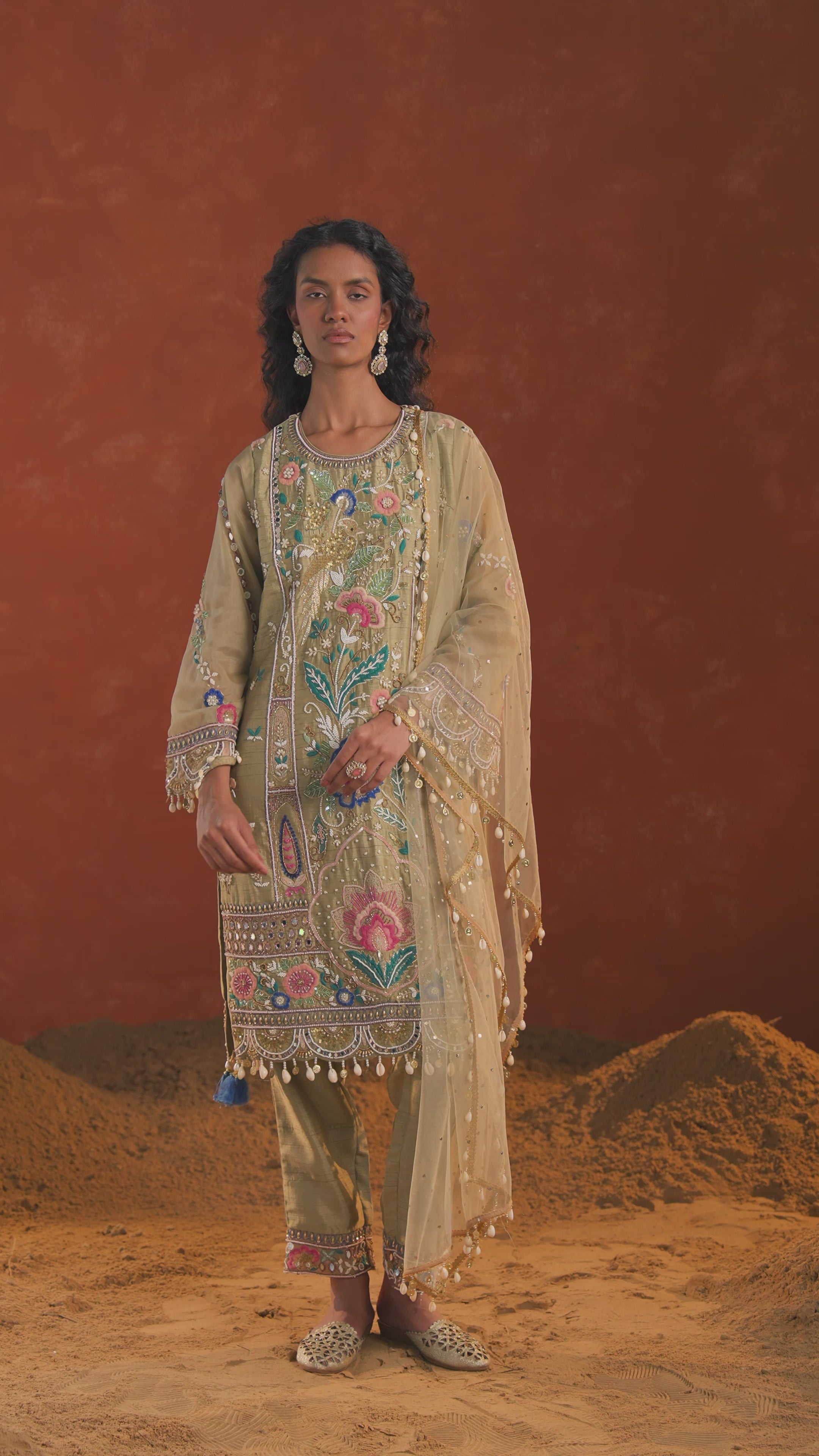 Greyish Green Embellished Shimmer Tissue Silk Kurta Set