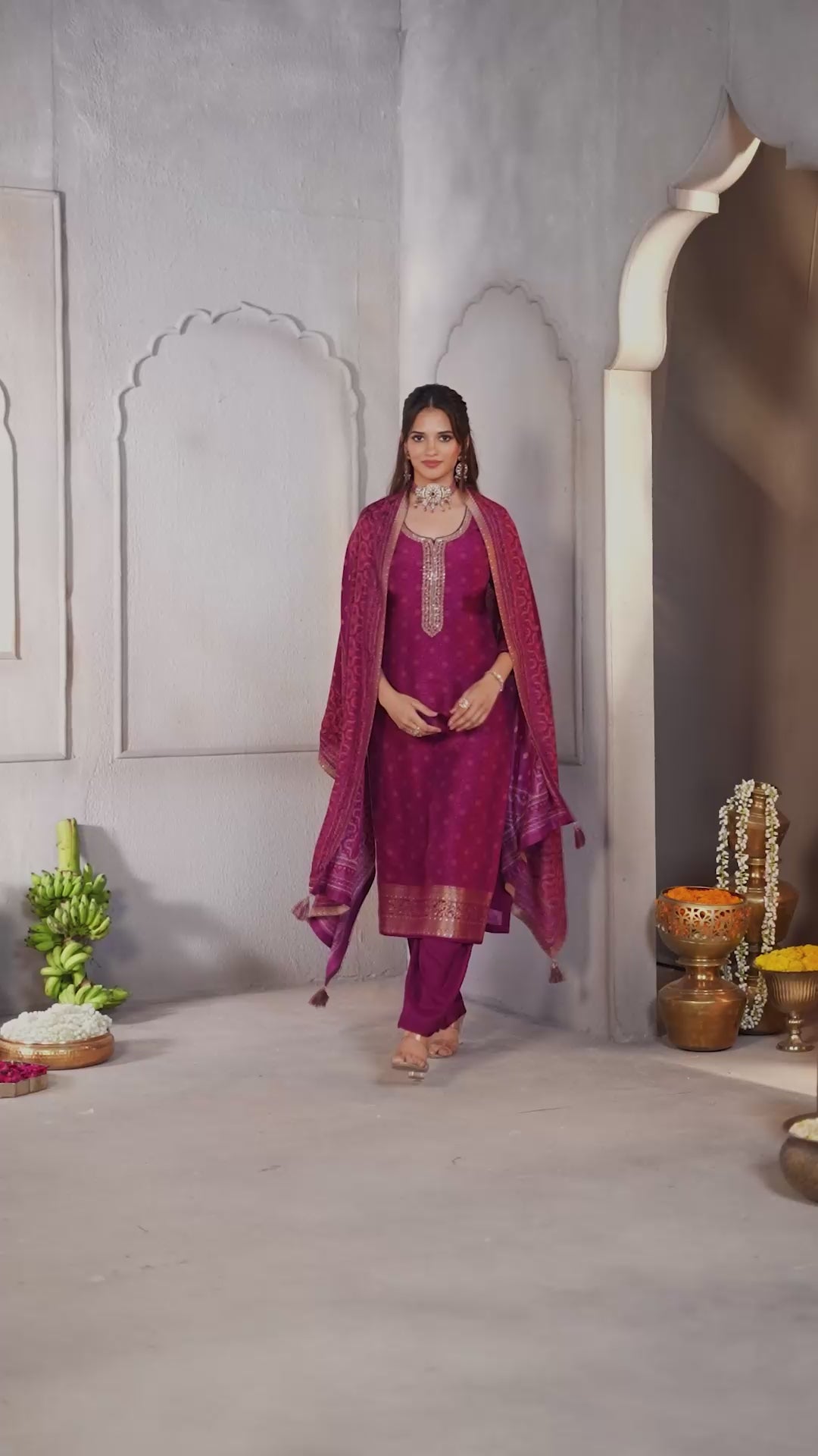 Magenta Purple Printed Dola Silk Pant Set