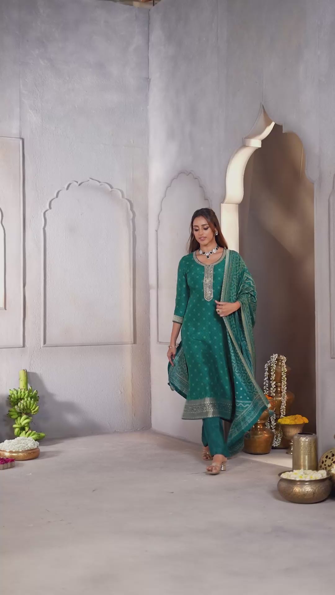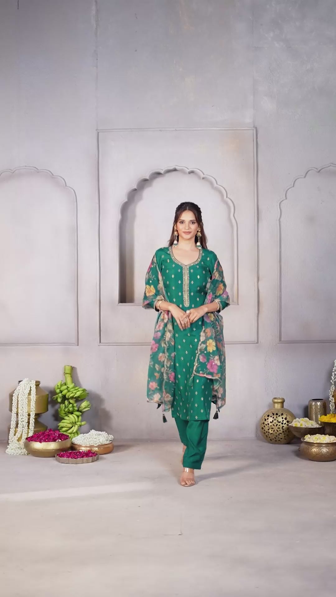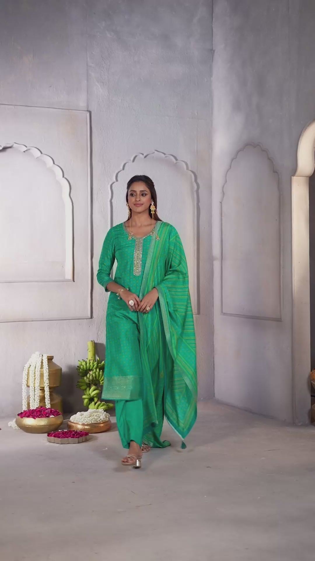 Peacock Green Printed Dola Silk Pant Set