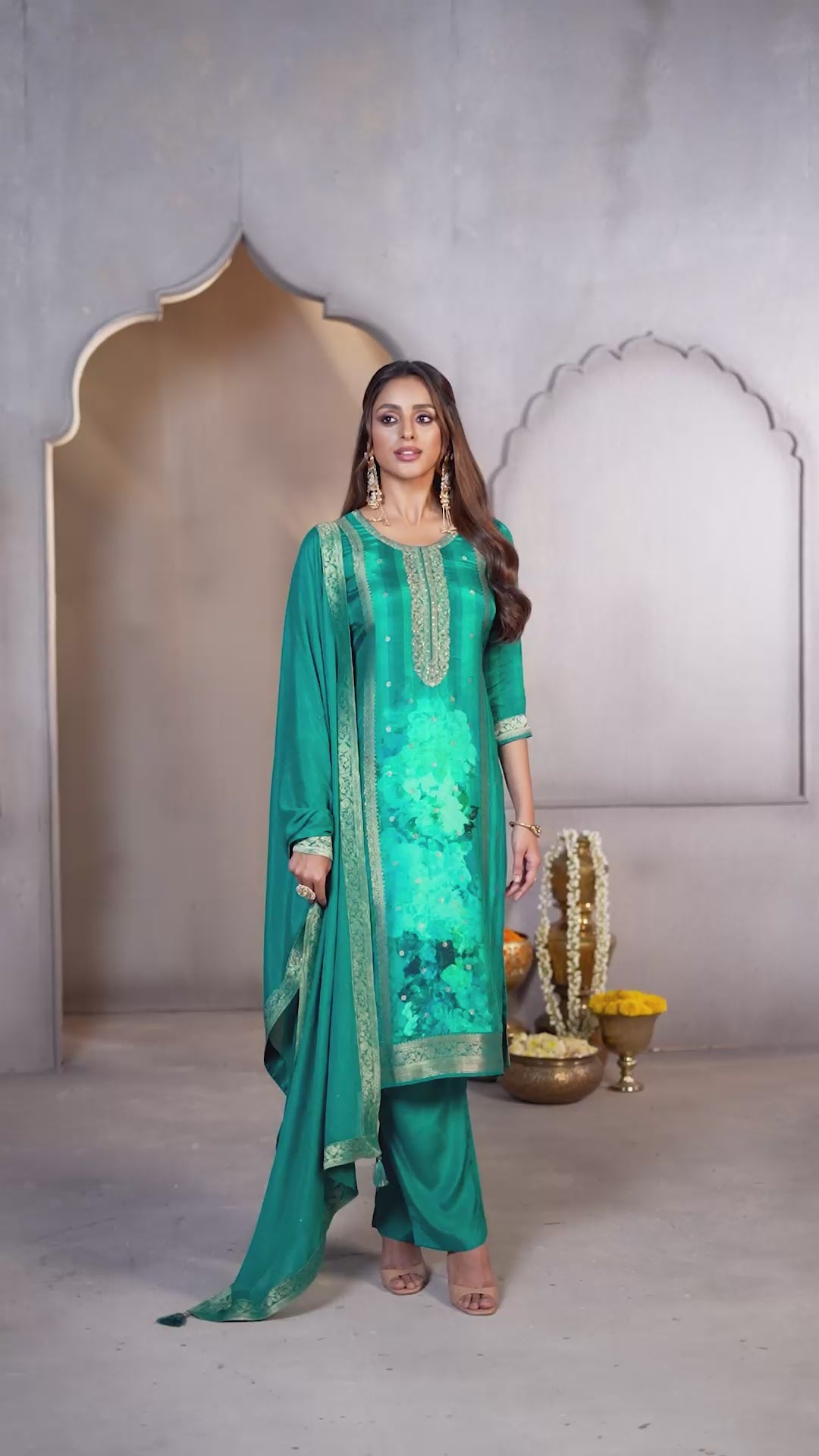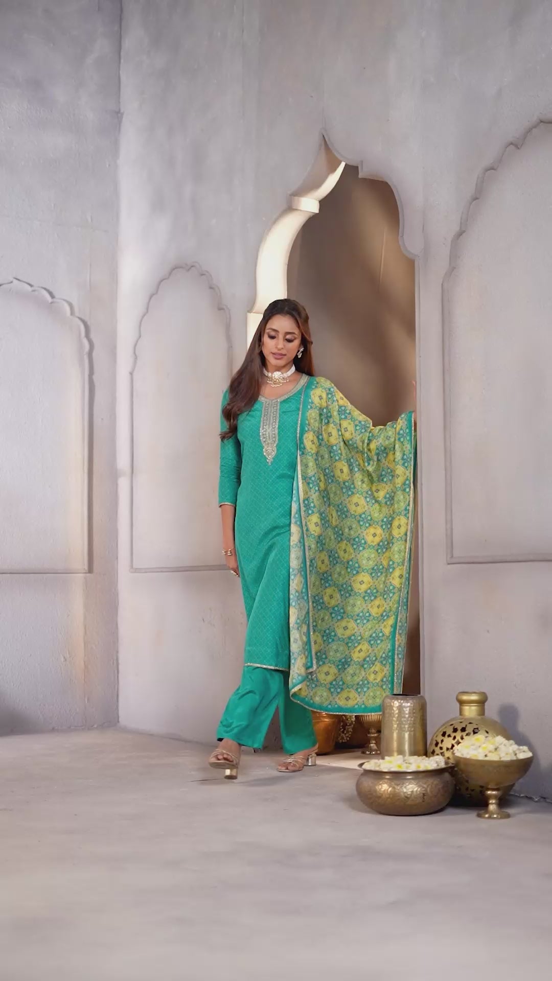 Teal Green Printed Dola Silk Pant Set
