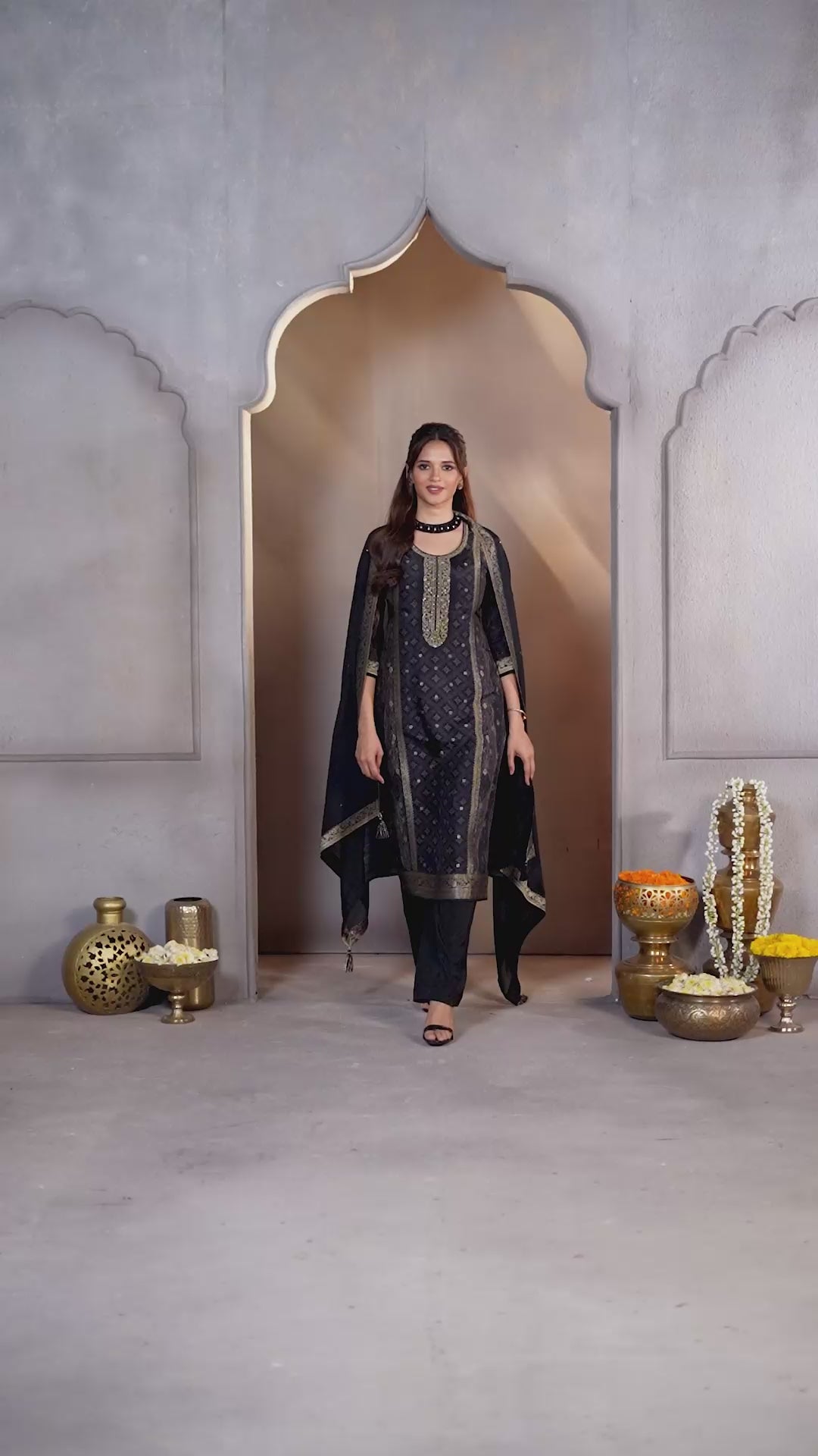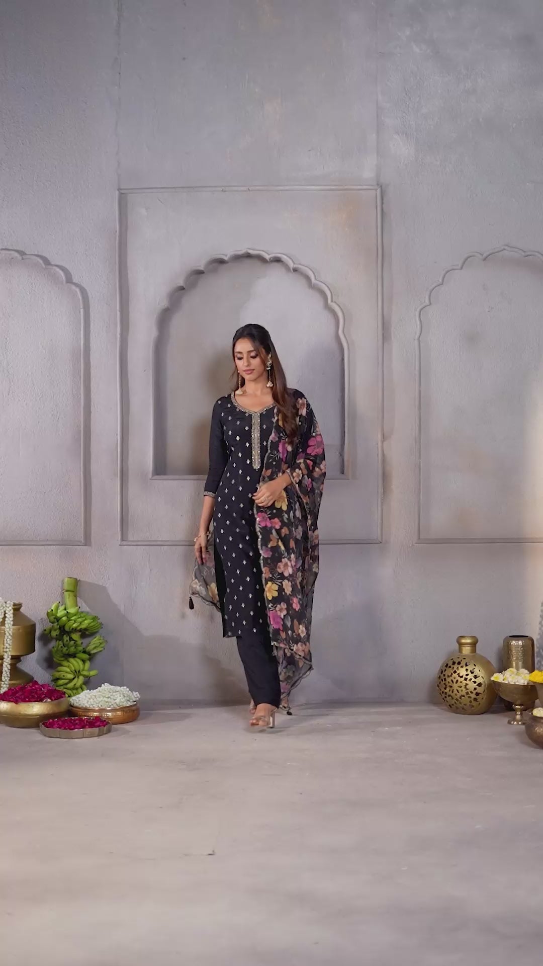 Classic Black Embellished Dola Silk Pant Set