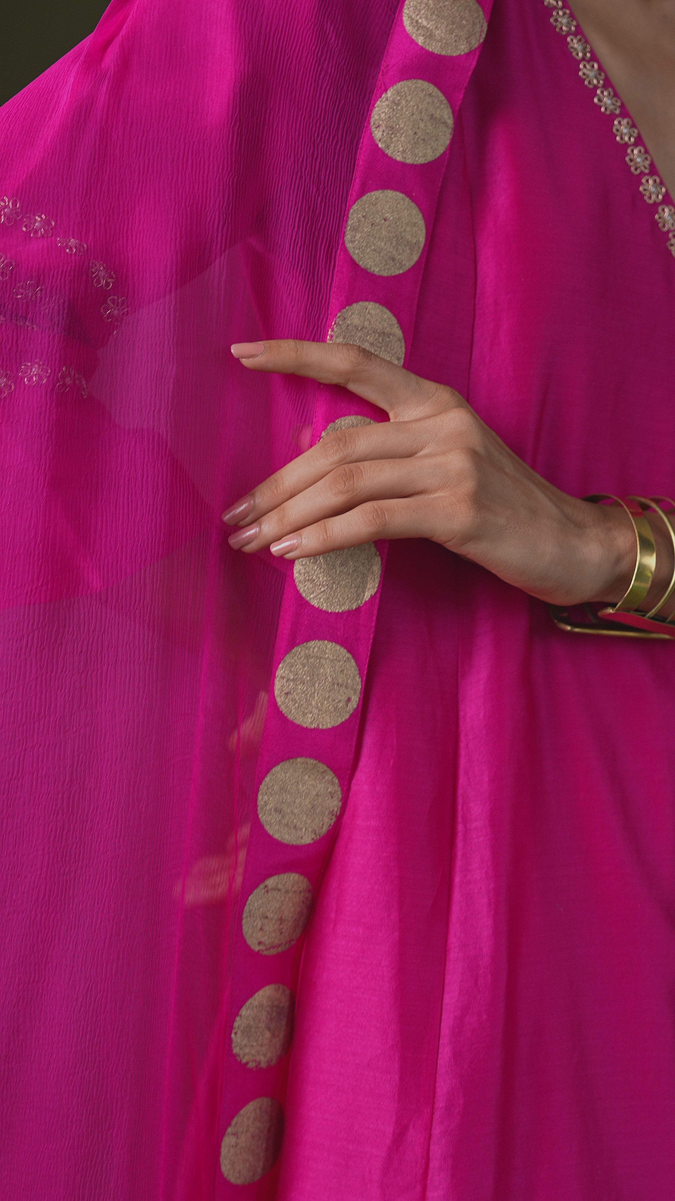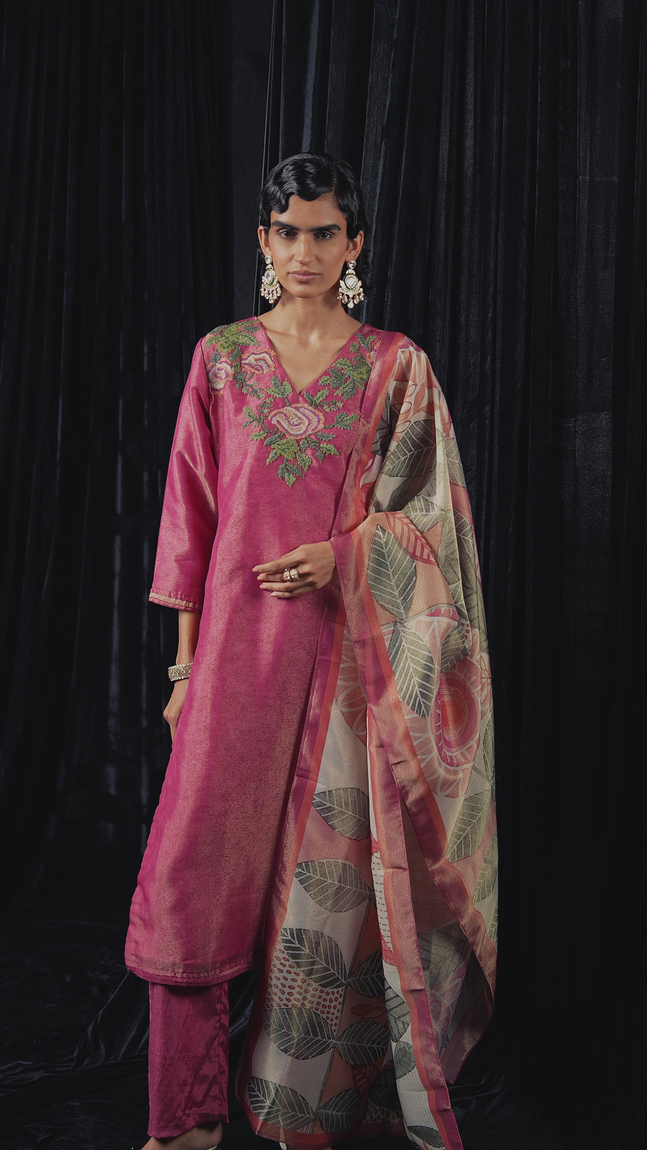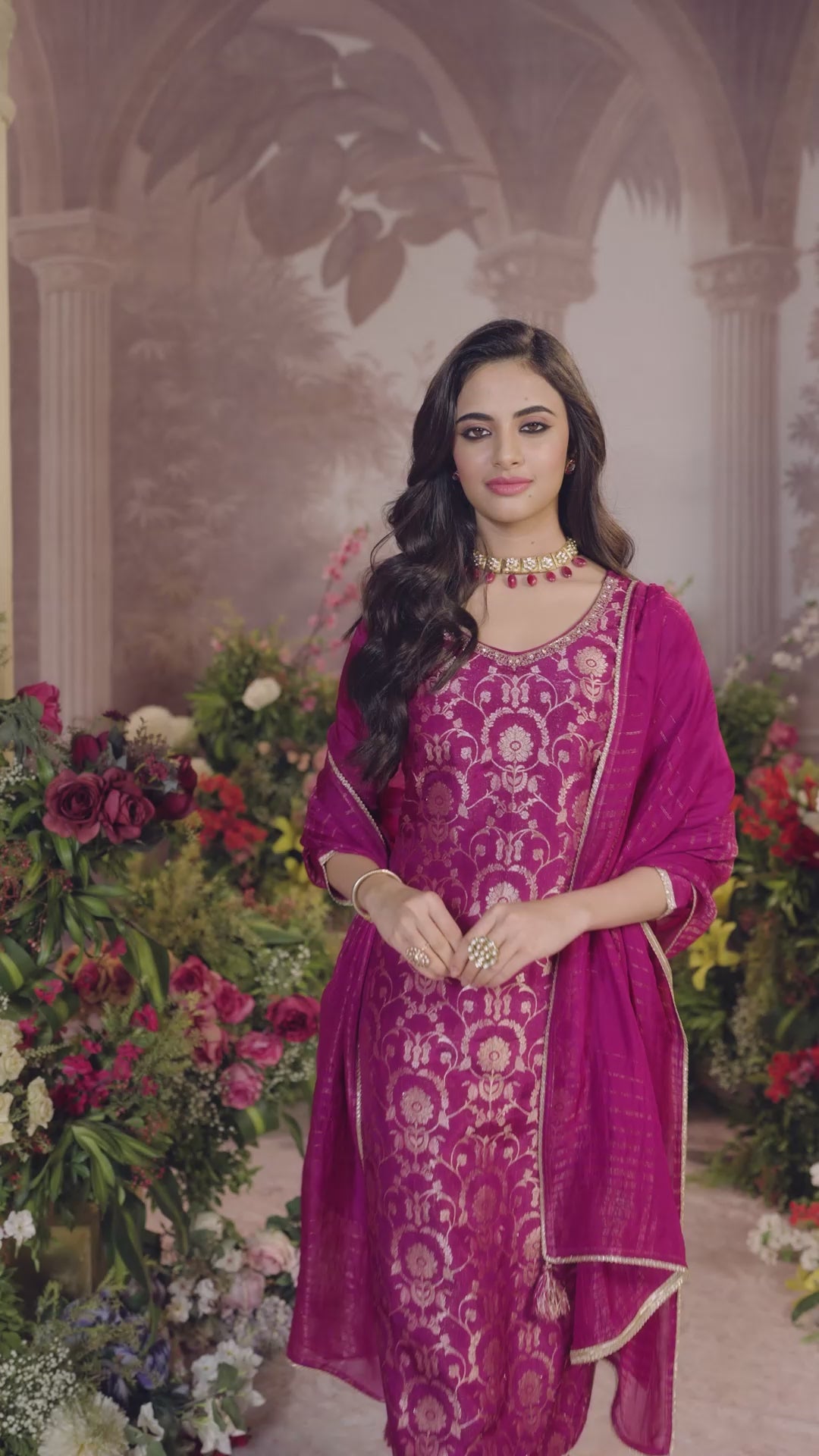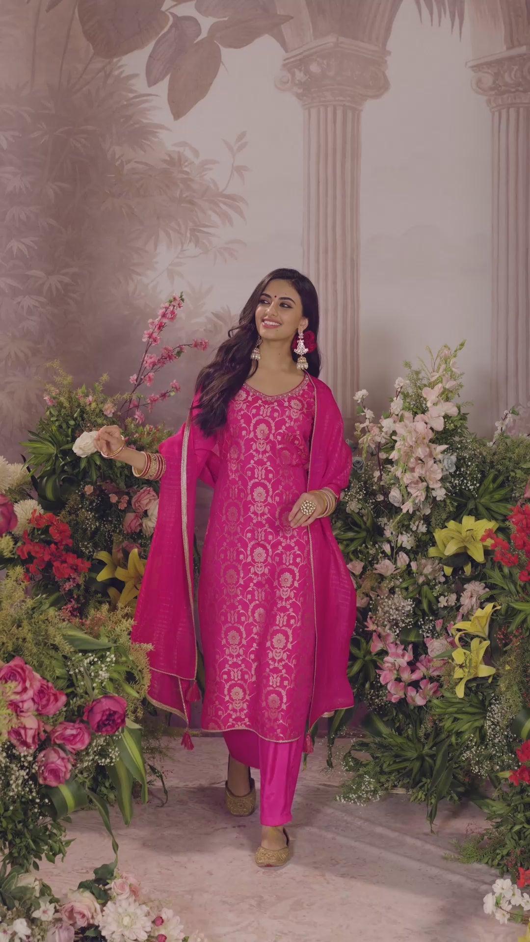 Fuchsia Pink Embellished Brocade Silk Pant Set