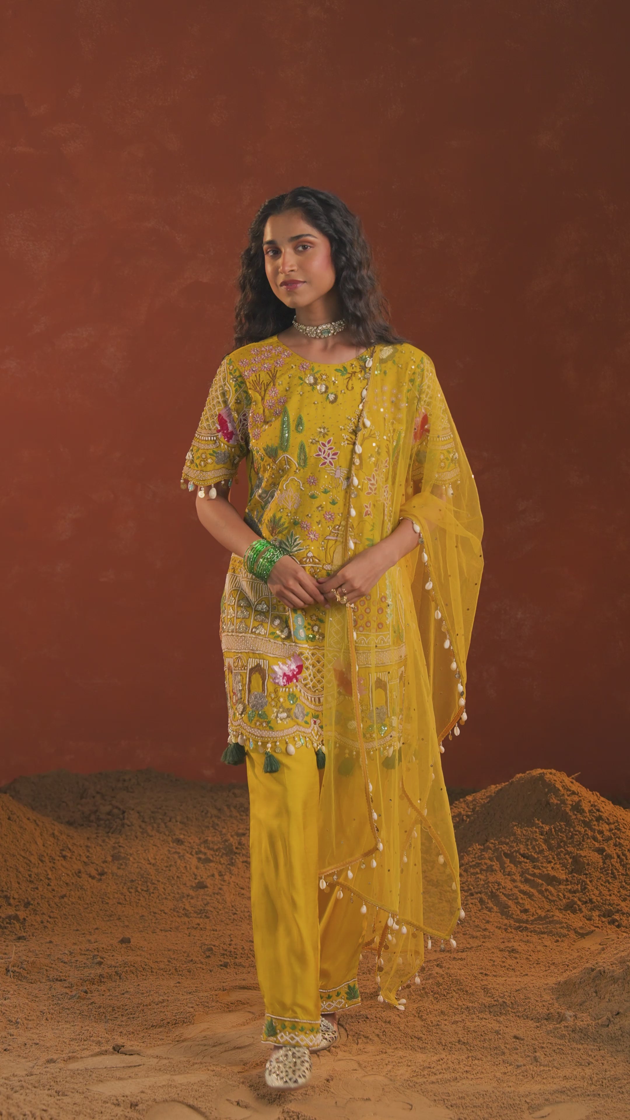 Mustard Yellow Embellished Chinon Silk Pant Set