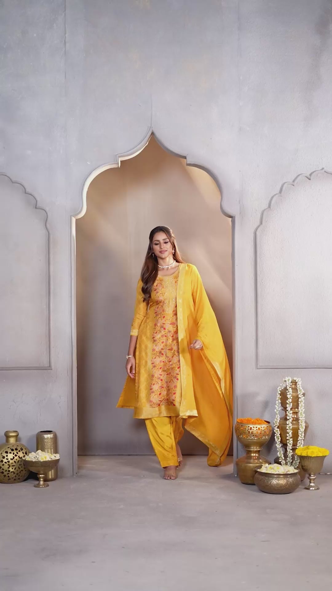 Golden Yellow Printed Dola Silk Pant Set