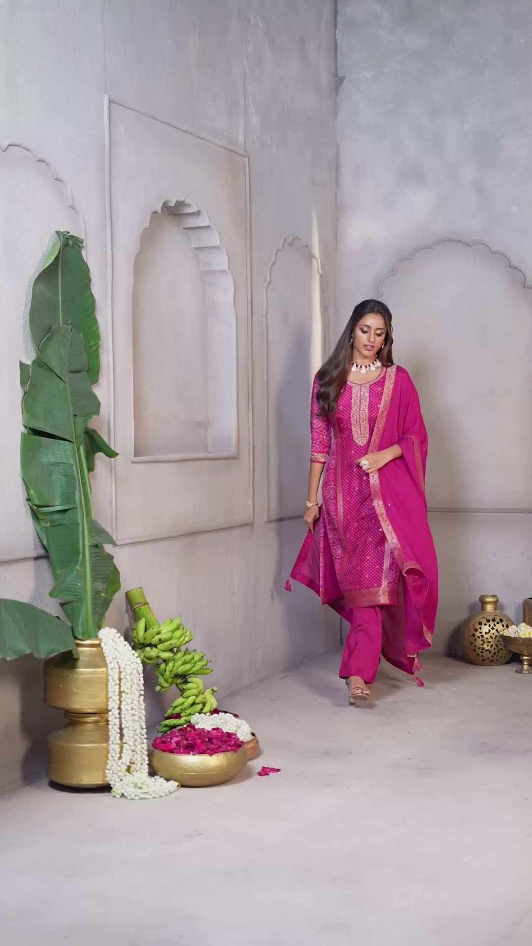 Fuchsia Pink Printed Dola Silk Pant Set