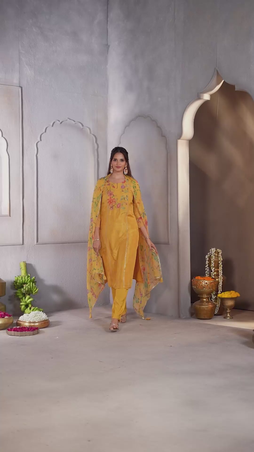 Turmeric Yellow Printed Dola Silk Pant Set