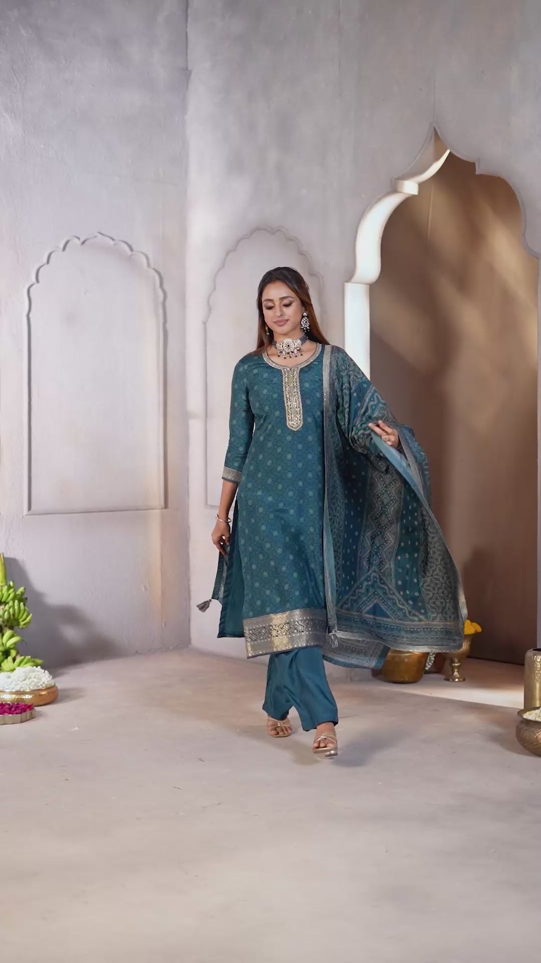 Deep Teal Printed Dola Silk Pant Set