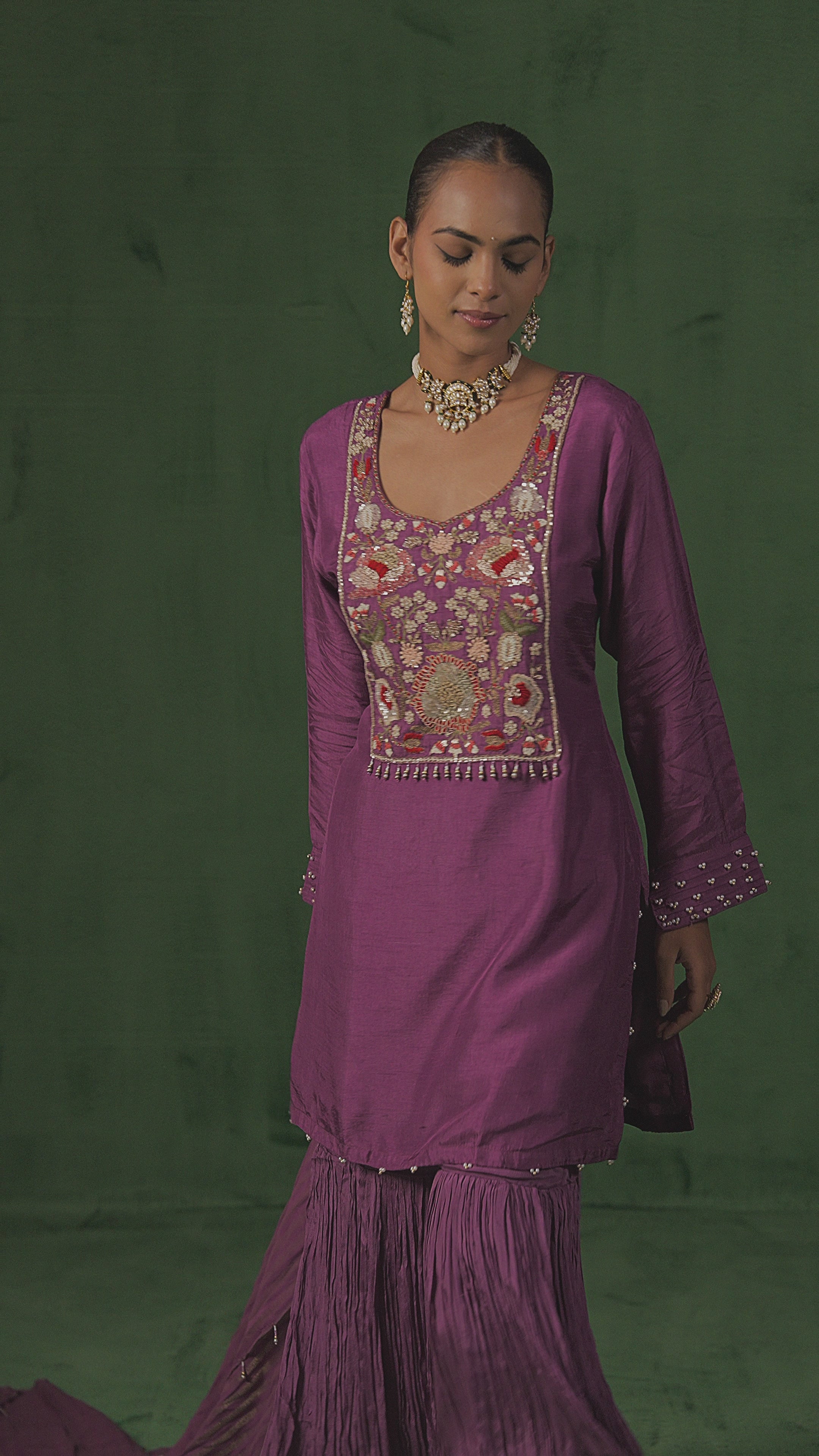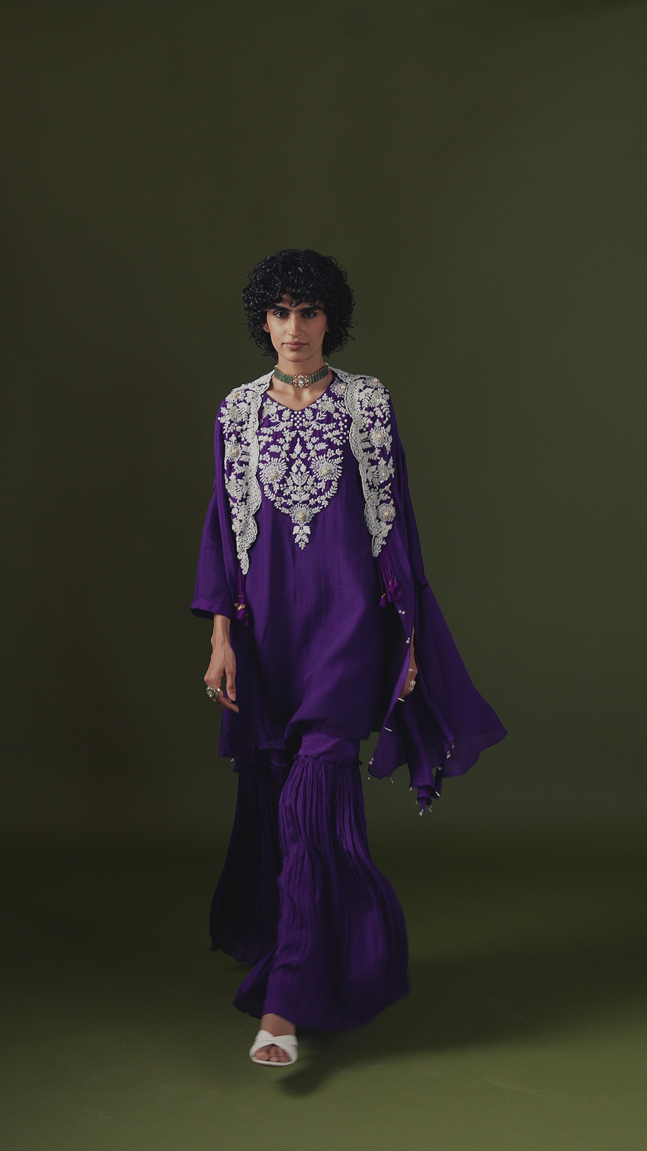 Regal Voilet Embellished Chinon Silk Sharara Set