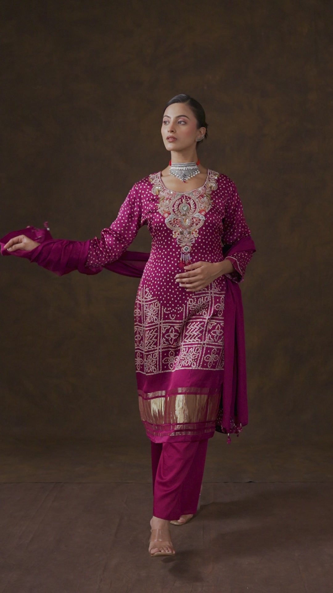 Magenta Pink Embellished Satin Silk Palazzo Set