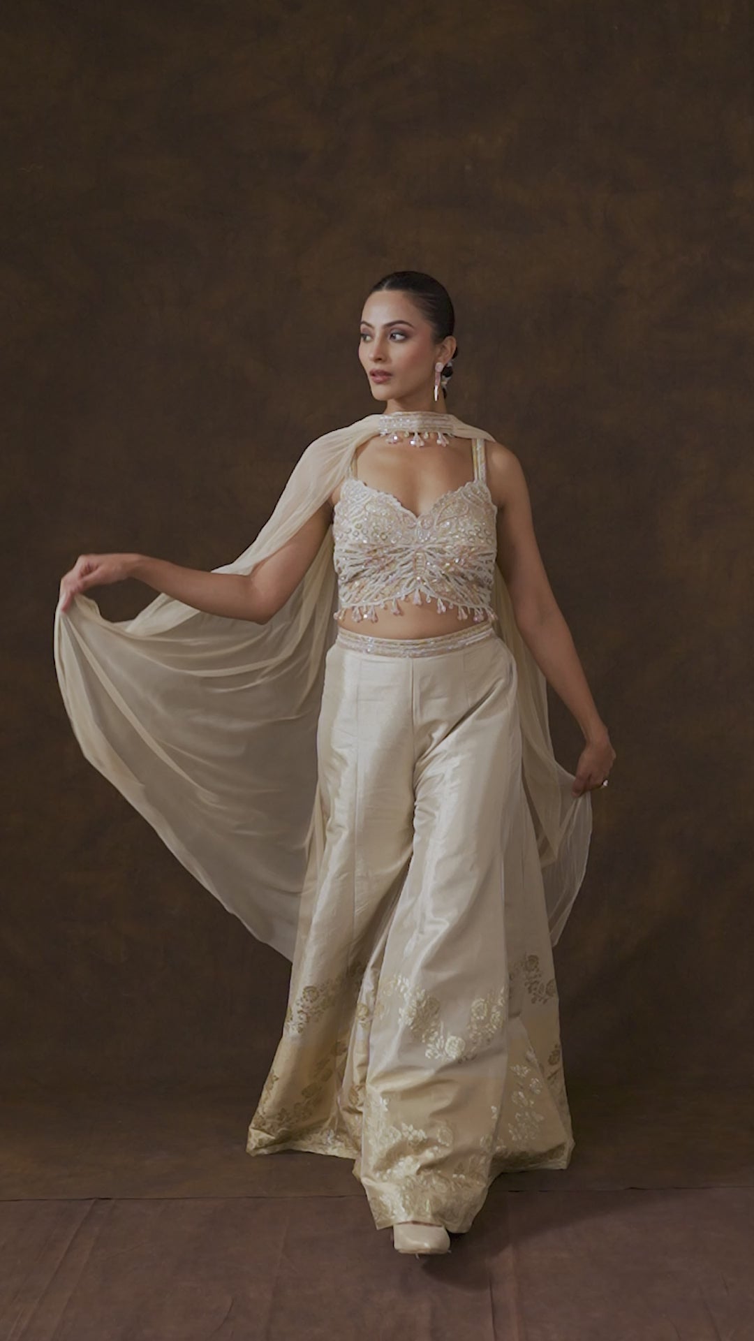 Dusty Beige Embellished Shimmer Tissue Silk Sharara Set