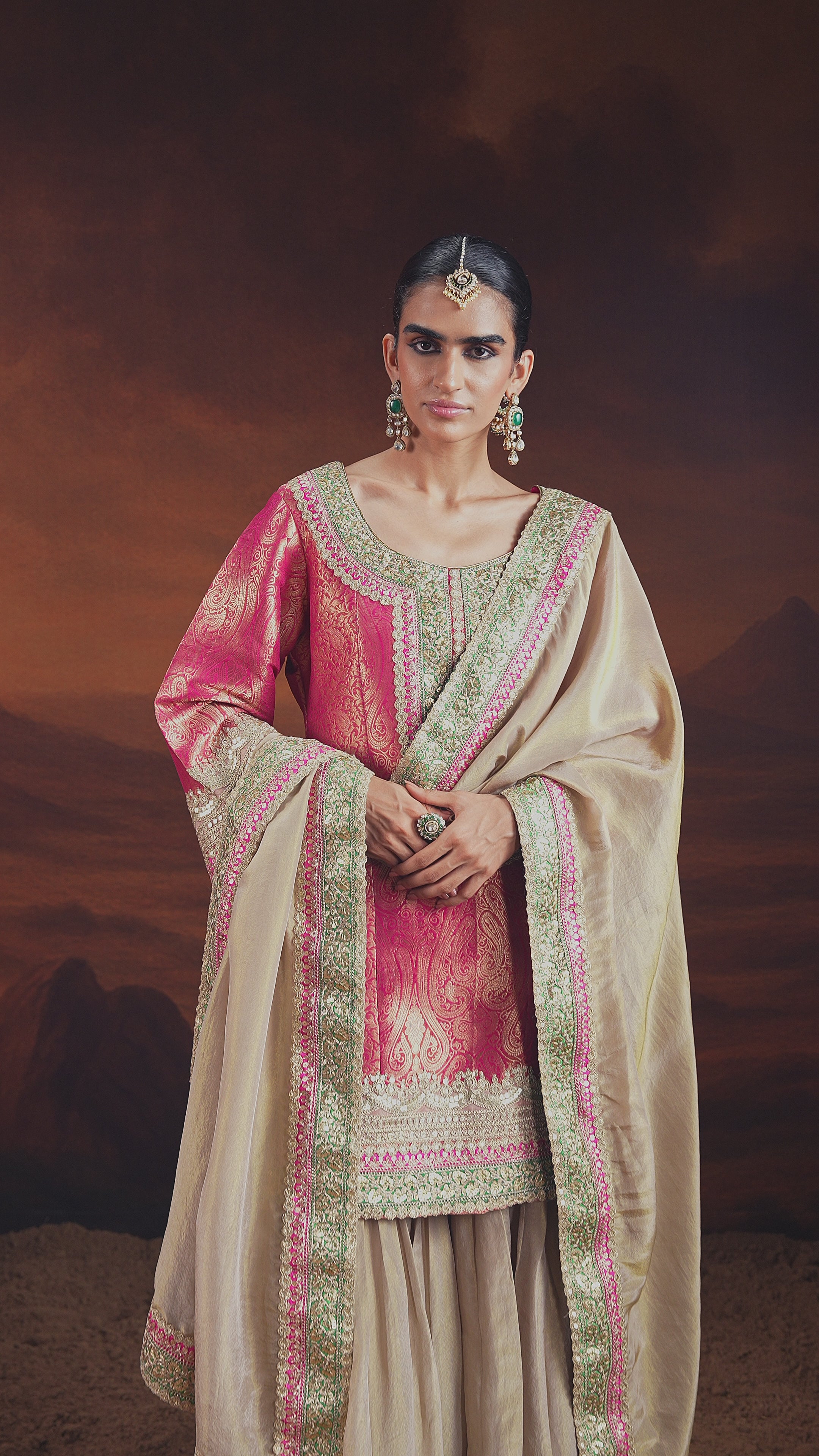 Champagne Gold Embellished Brocade Silk Sharara Set