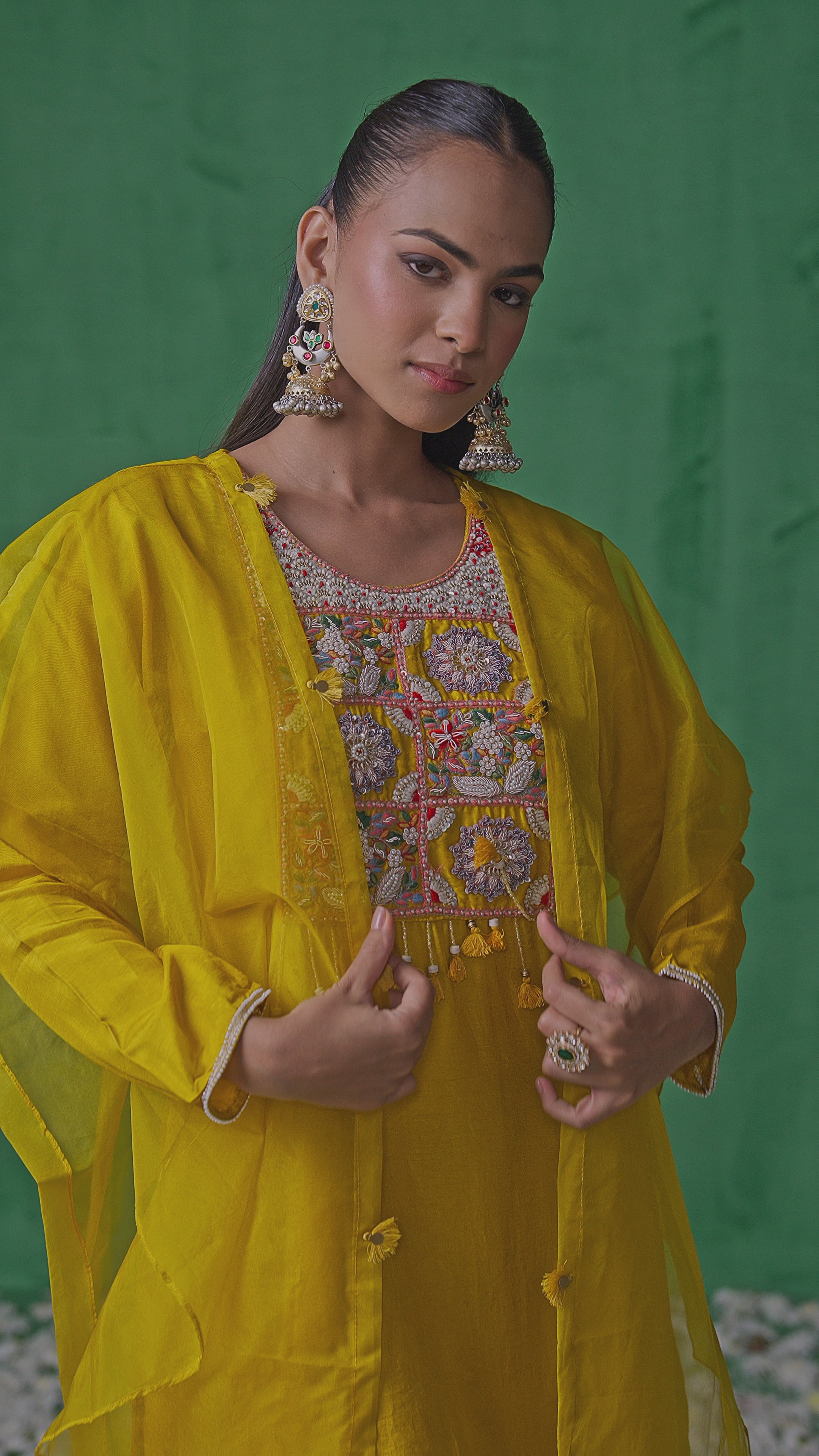 Mustard Yellow Embellished Dola Silk Sharara Set