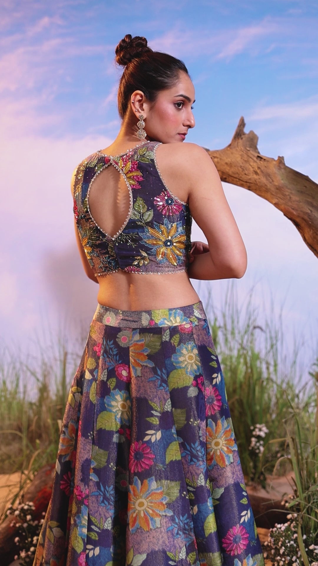 Royal Blue Embellished Shimmer Tissue Silk Lehenga Set