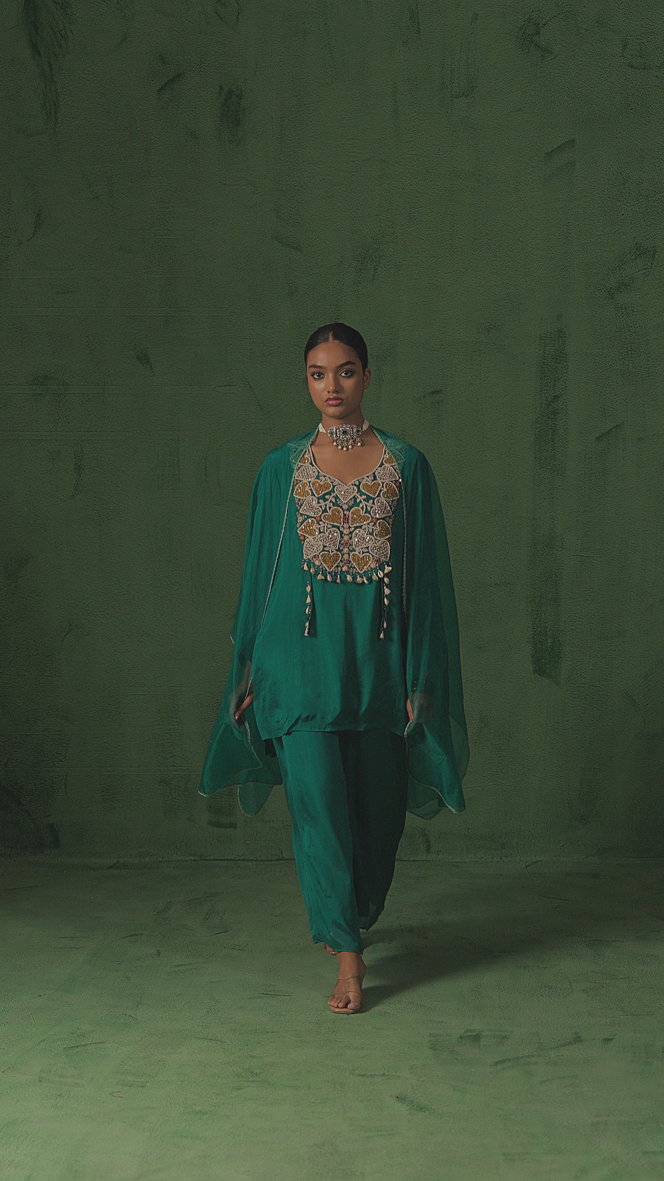 Teal Green Embellished Chinon Silk Palazzo Set
