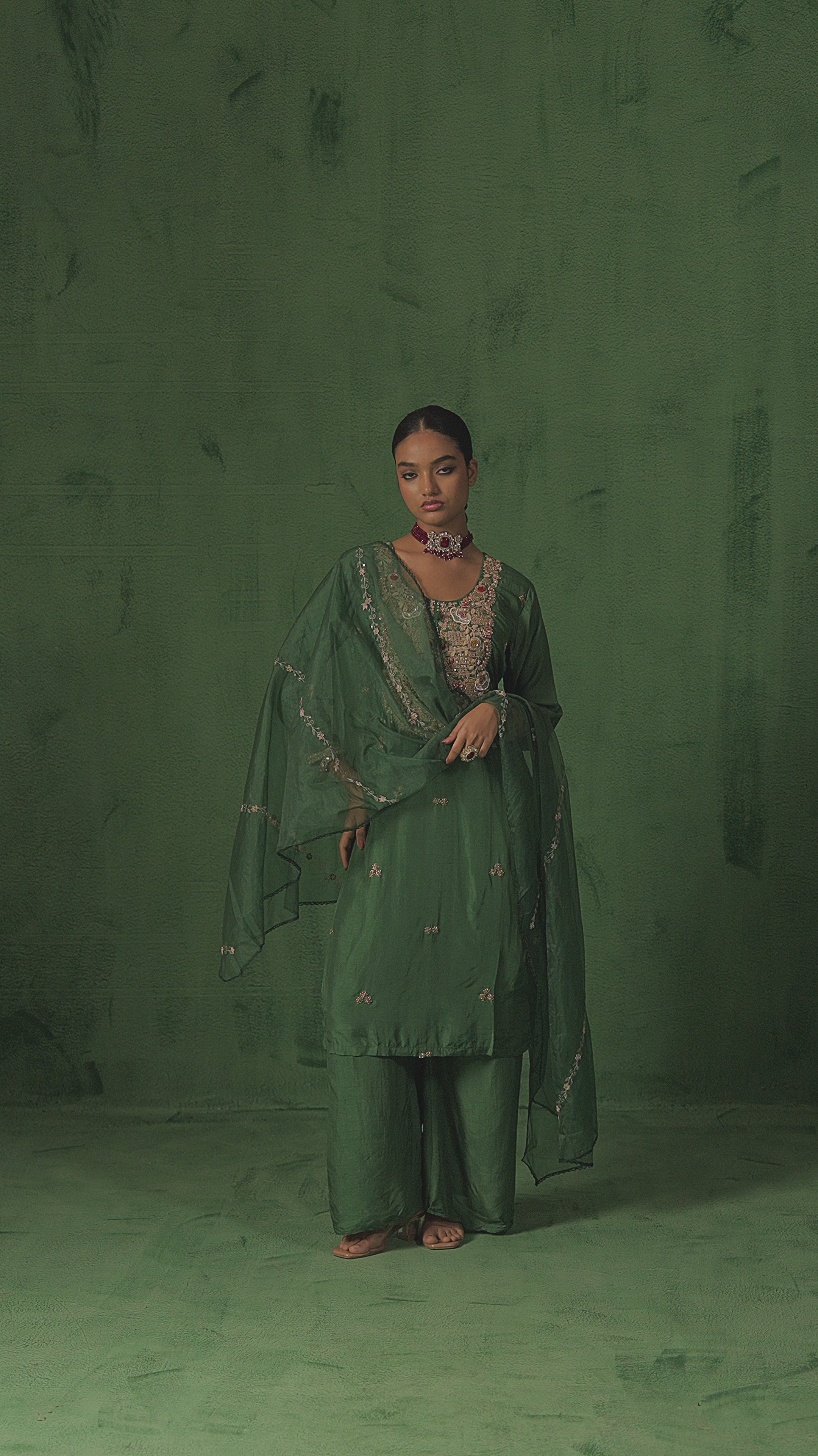 Green Embellished Satin Silk Palazzo Set