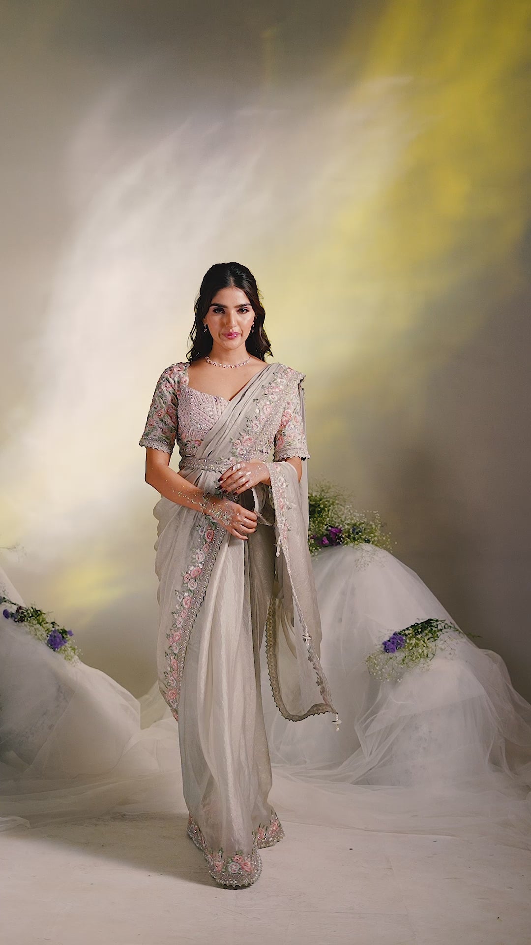 Lilac Embroidered Shimmer Tissue Silk Saree