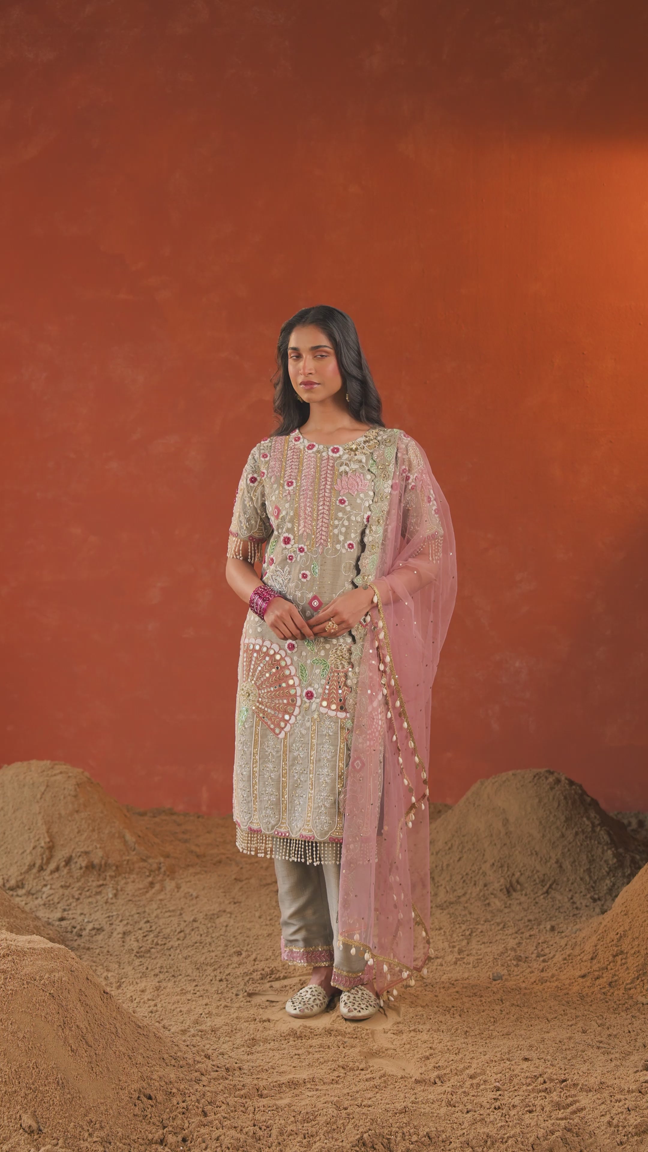 Icy Gray Embellished Shimmer Tissue Silk Palazzo Set