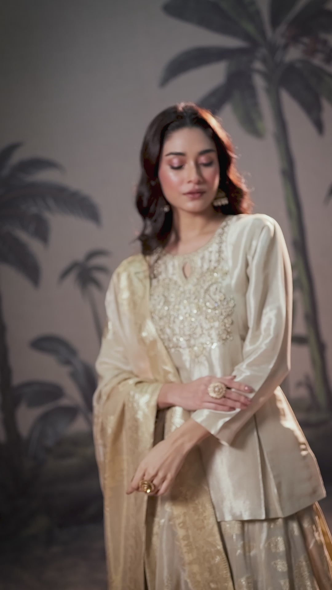 Champagne Beige Embellished Chinon Silk Sharara Set
