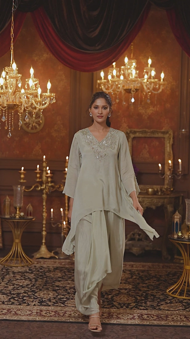 Pastel Green Embellished Chinon Silk Drape Skirt Set