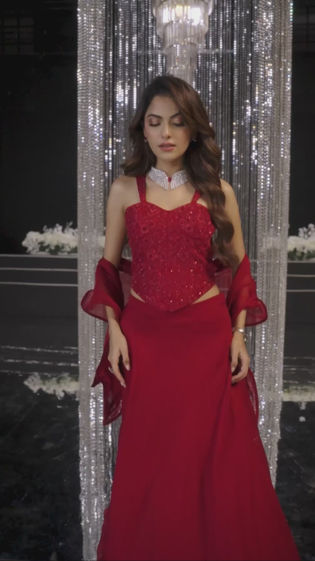 Magenta To Maroon Embellished Crepe Silk Skirt Set