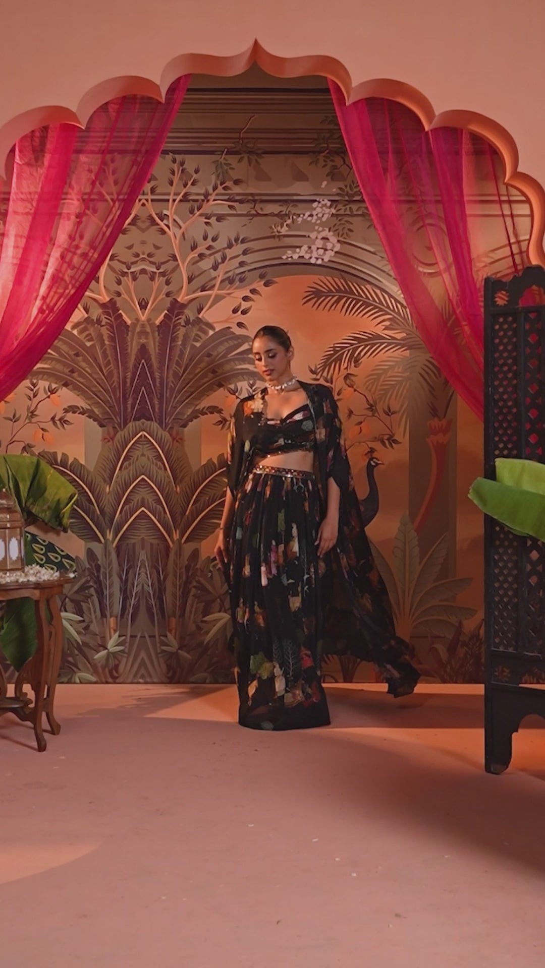Elegant Black Embellished Chinon Silk Cape Skirt Set