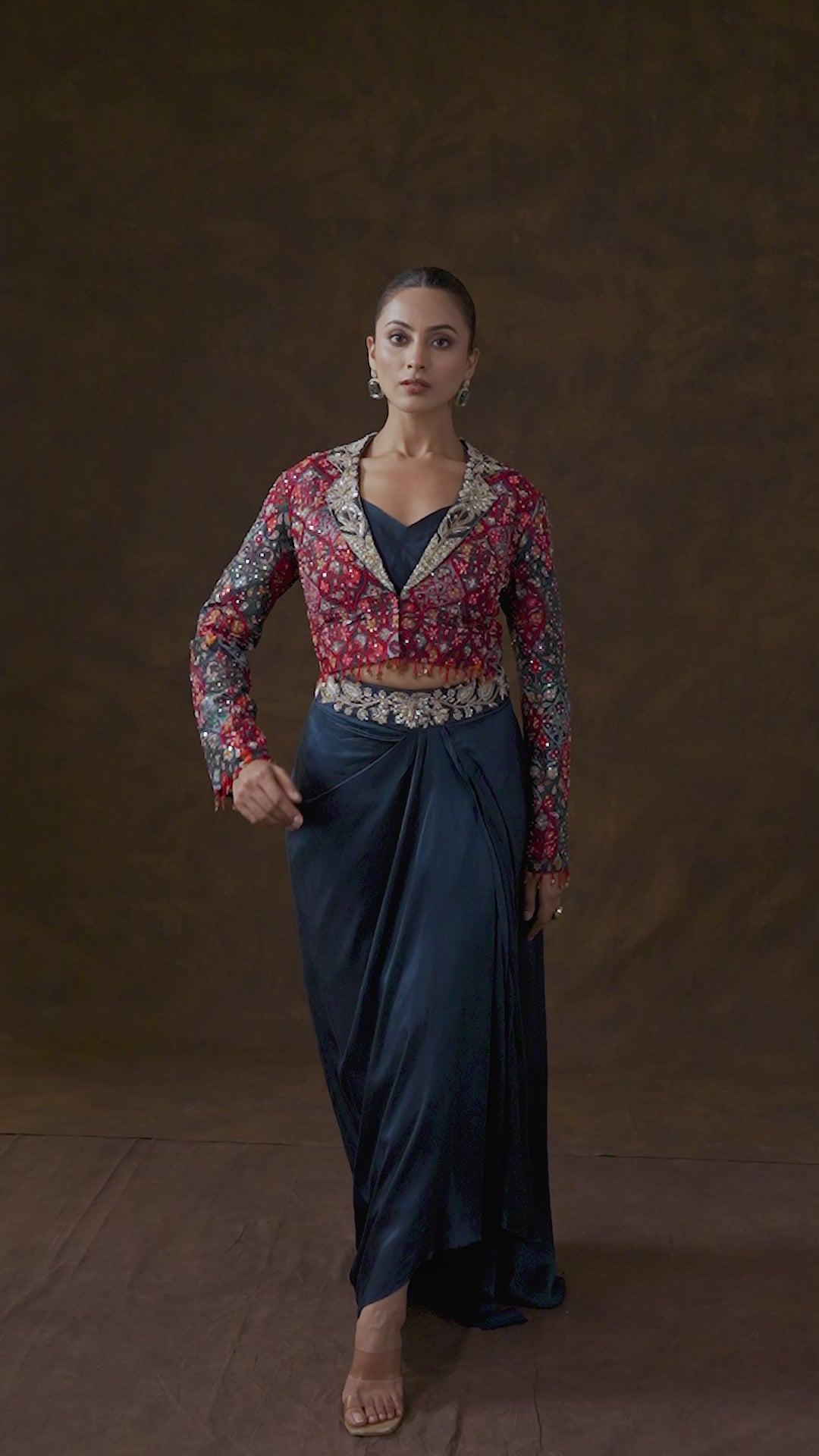 Navy Teal Embellished Chinon Silk Drape Skirt Set