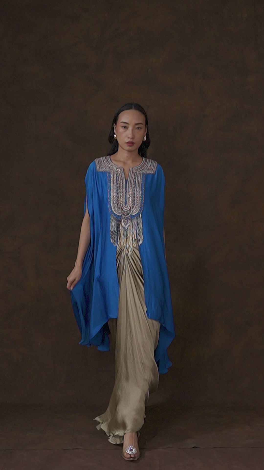 Deep Blue Embellished Satin Silk Cape Skirt Set
