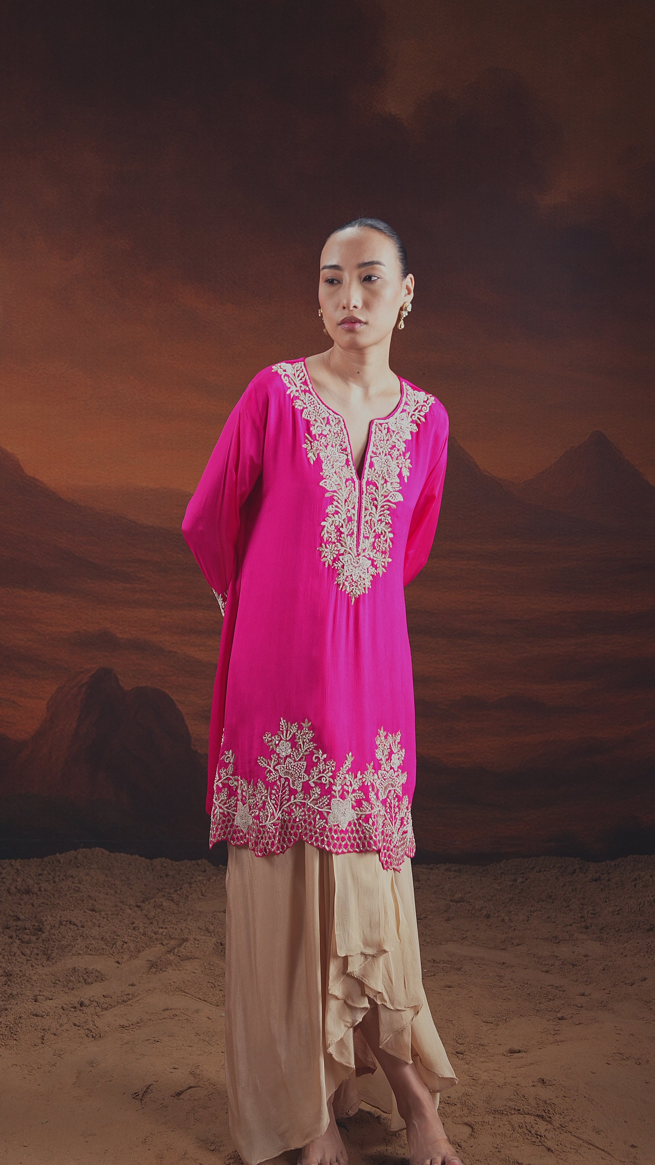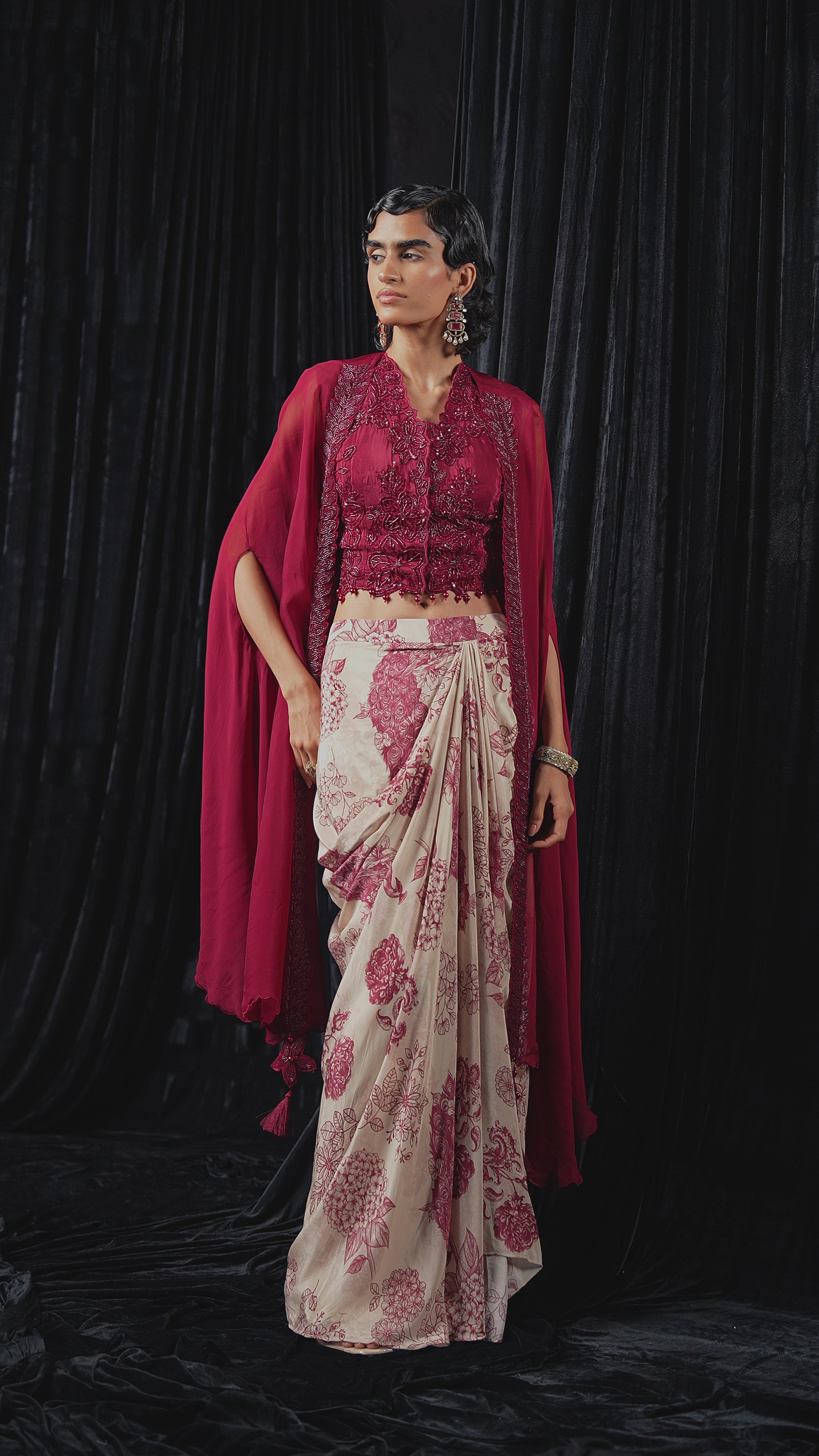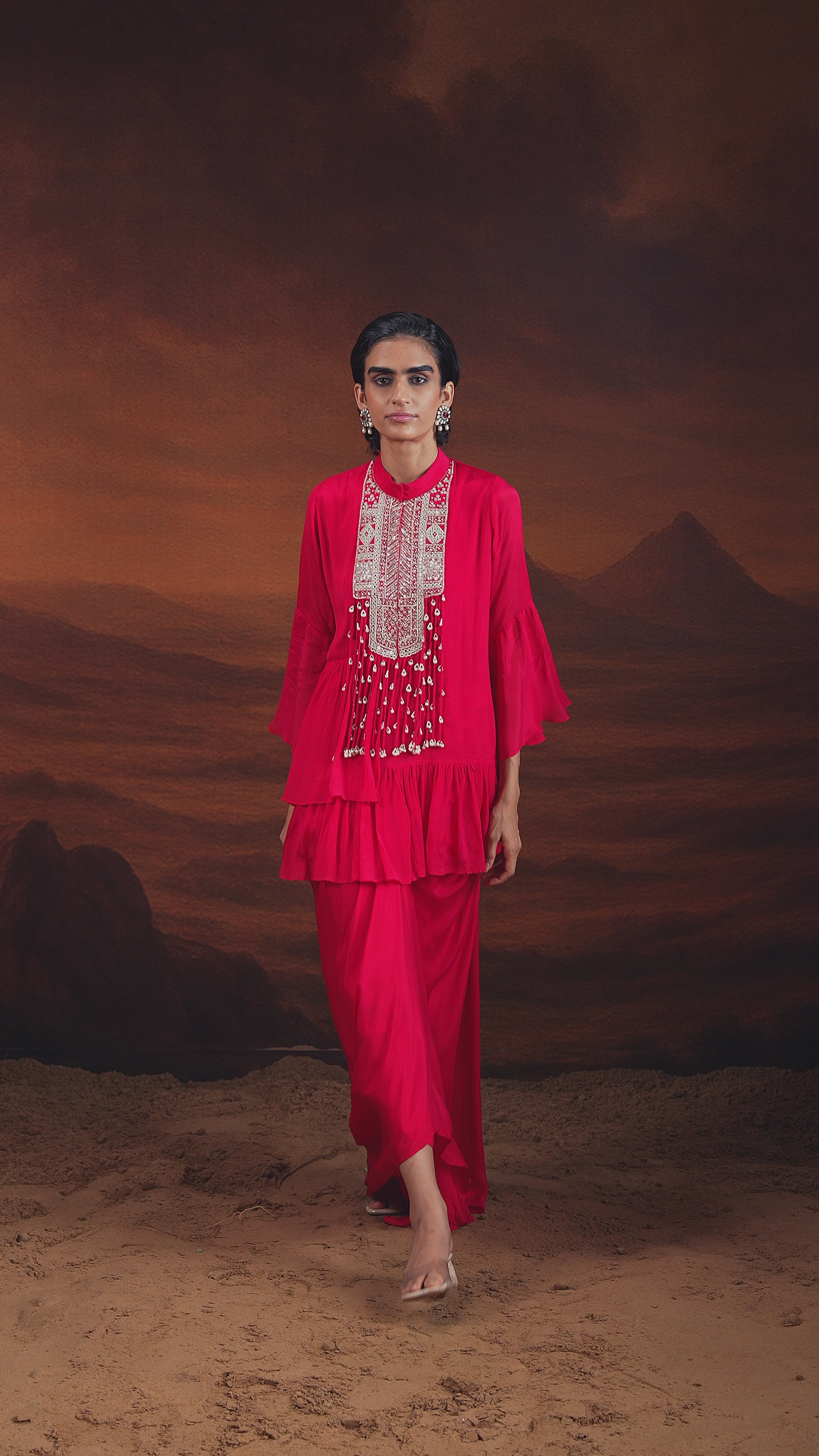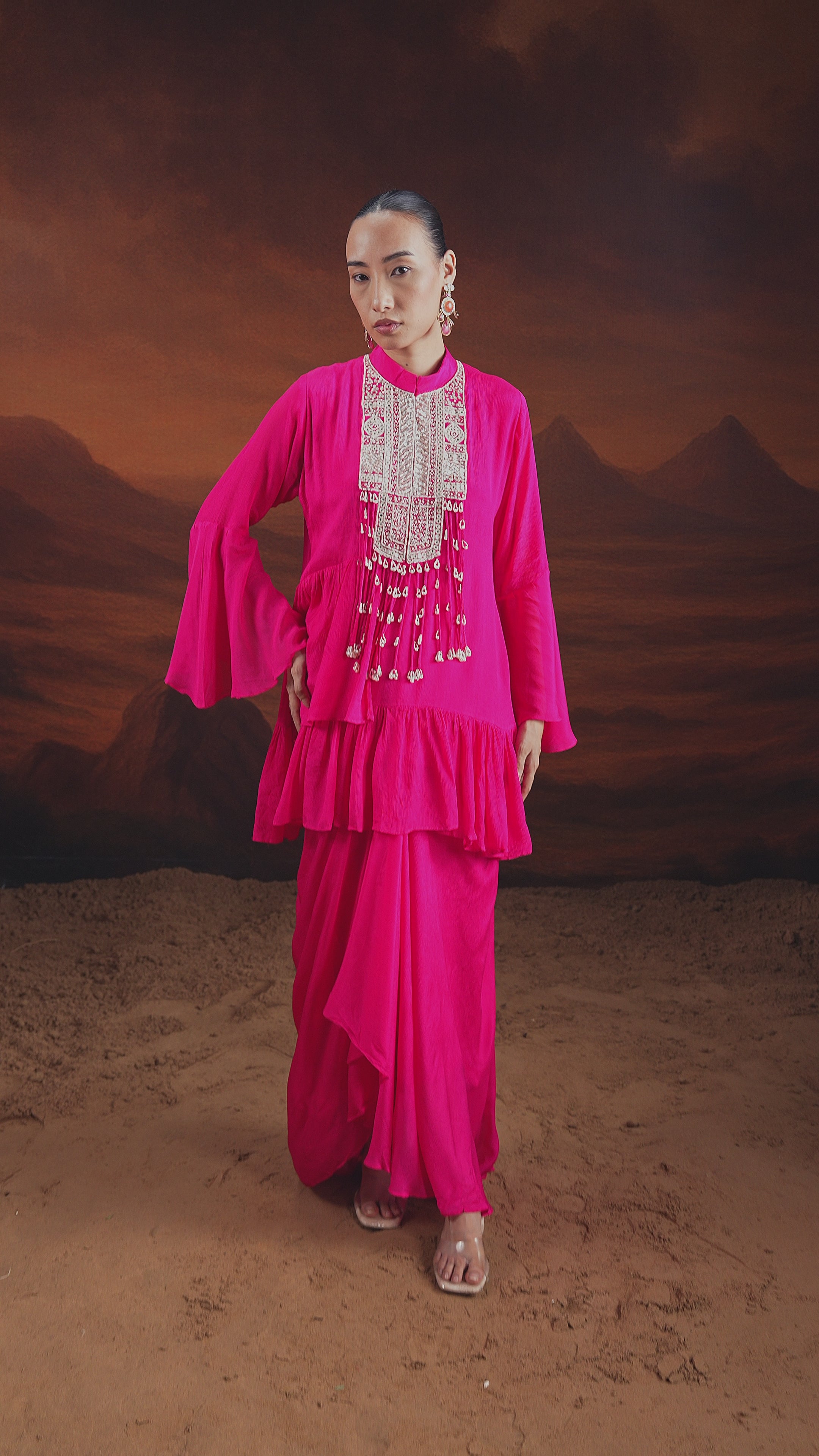 Hot Pink Embellished Georgette Silk Drape Skirt Set