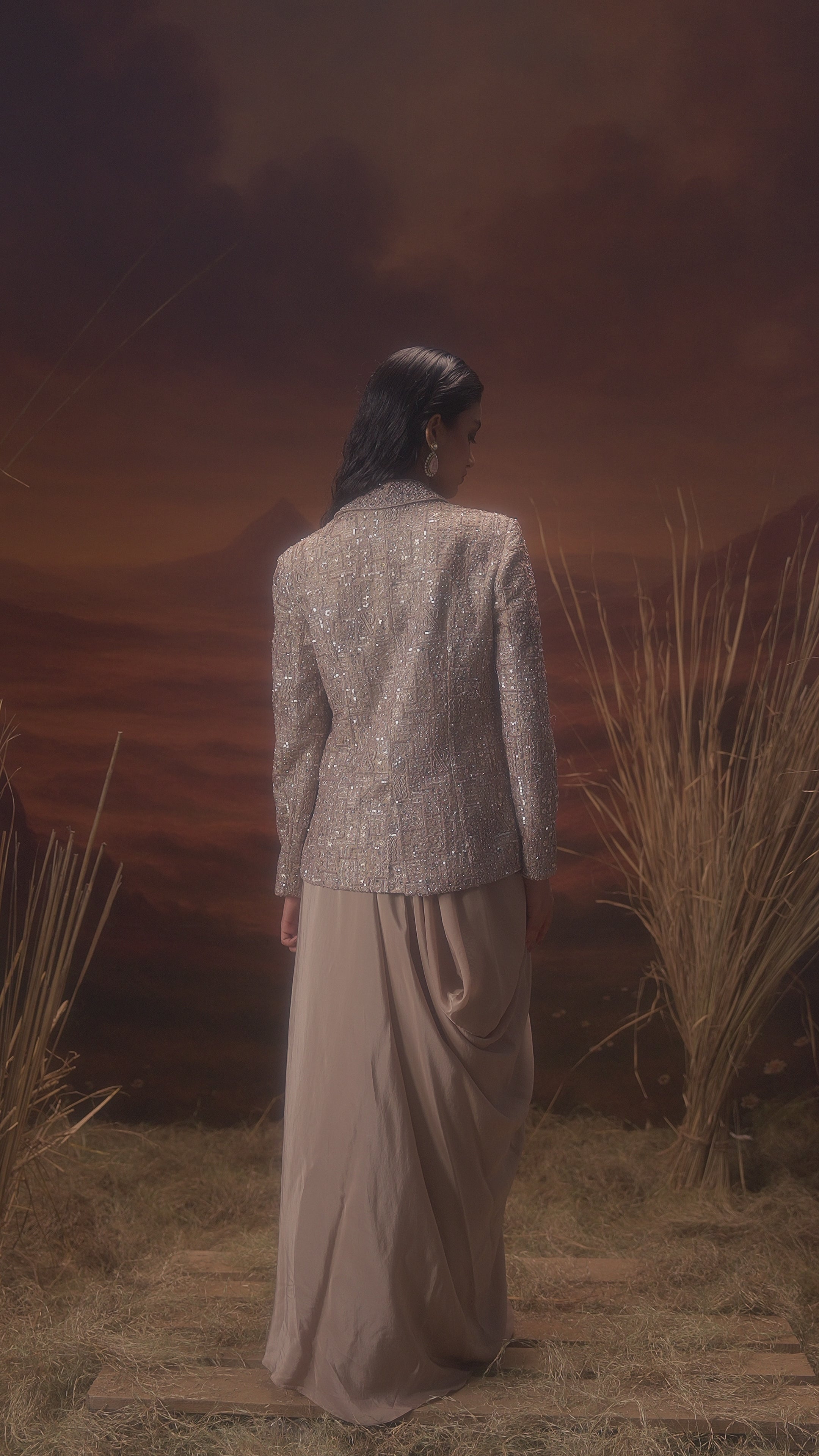 Champagne Beige Embellished Satin Silk Drape Skirt With Jacket