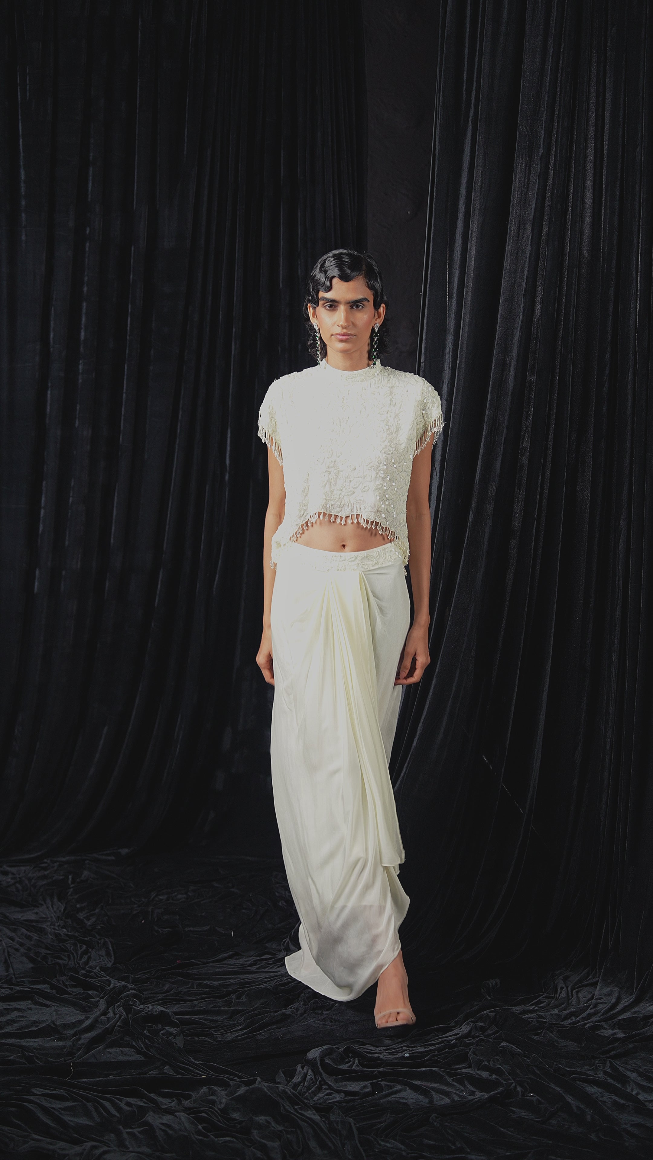 Cream White Embellished Chinon Silk Drape Skirt Set