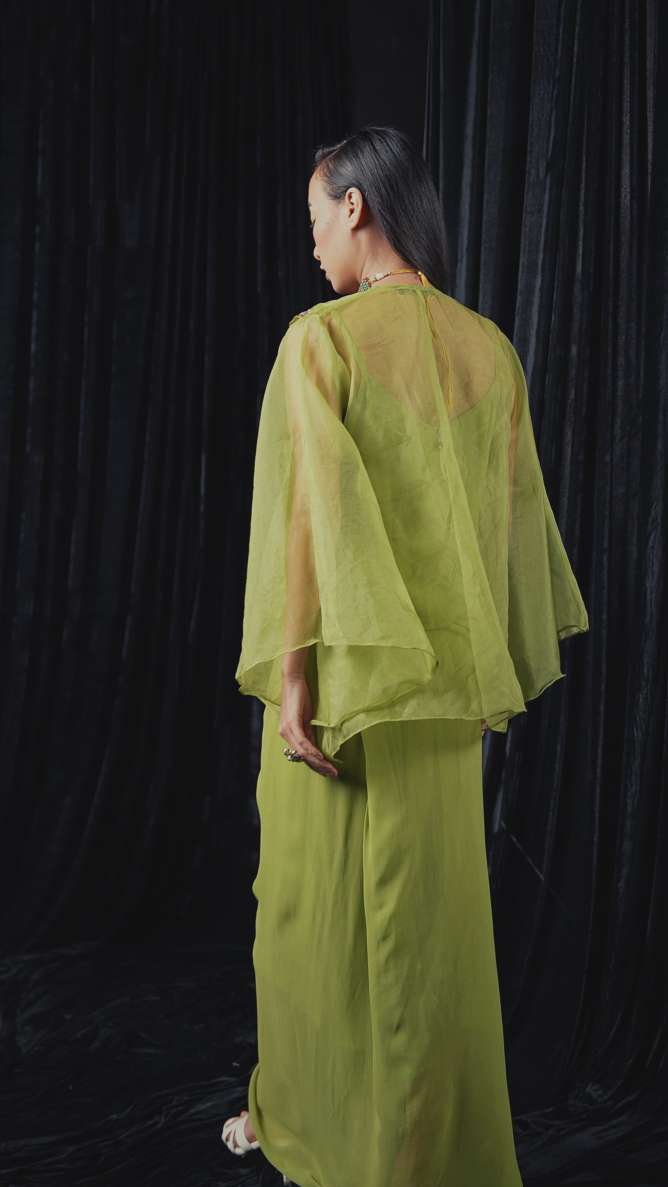 Lime Green Embellished Organza Silk Skirt Set