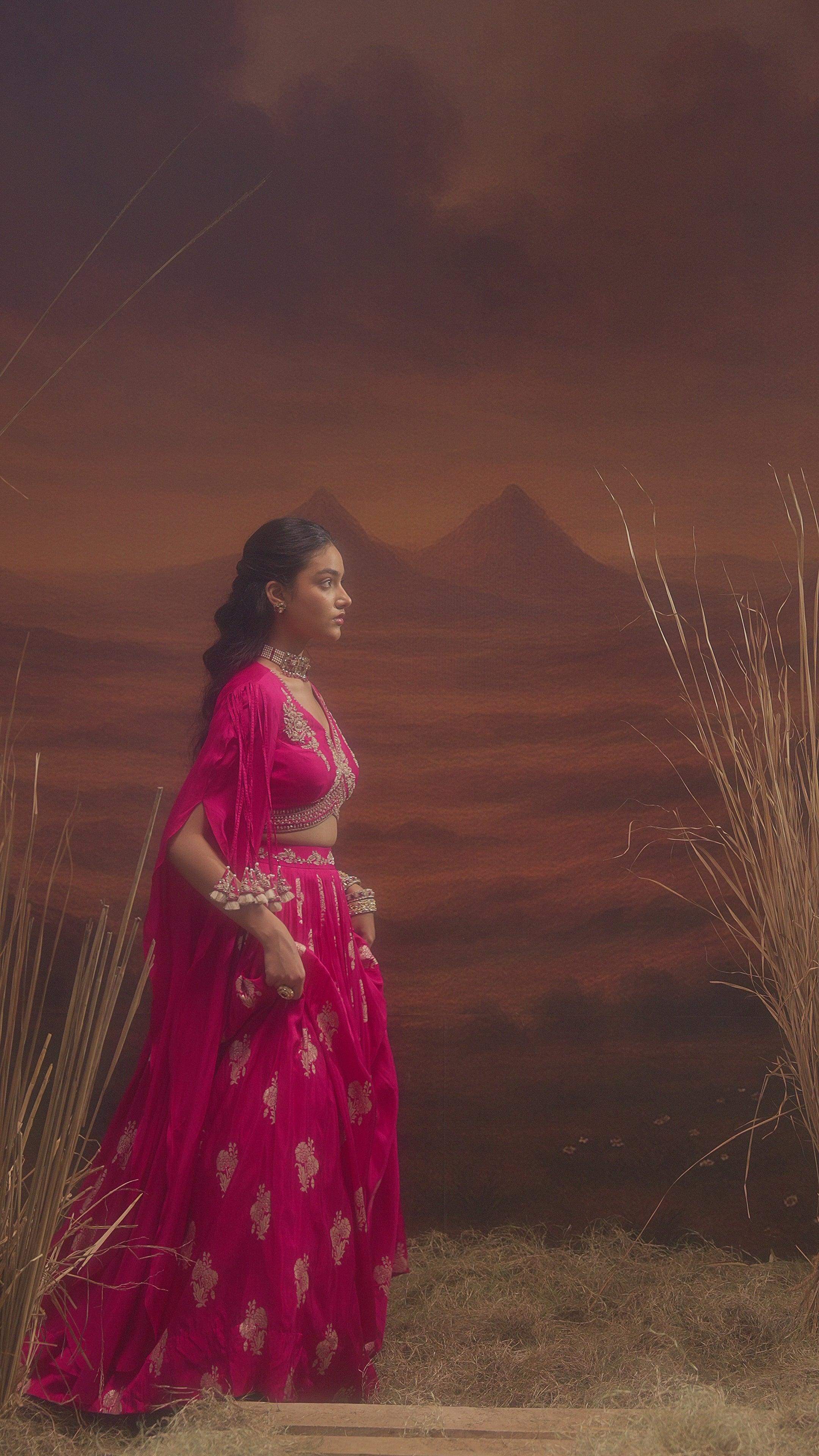 Magenta Pink Embellished Shimmer Tissue Silk Skirt Set