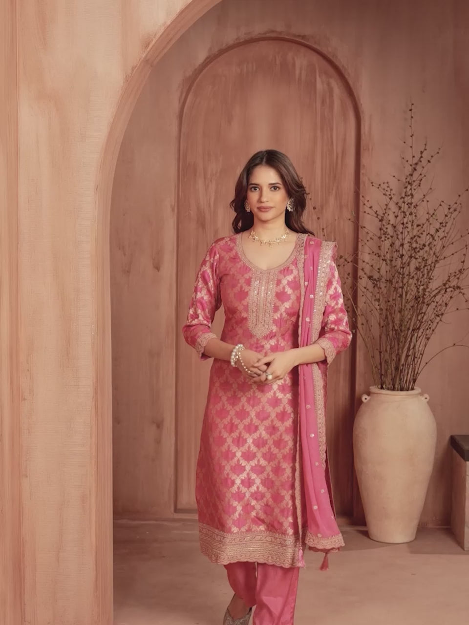 - Kurta: This kurta features a stunning all-over jacquard print in a geometric floral pattern. The neckline is heavily embellished with golden thread and sequins, a detail that is perfectly mirrored on the broad hemline and sleeve borders.