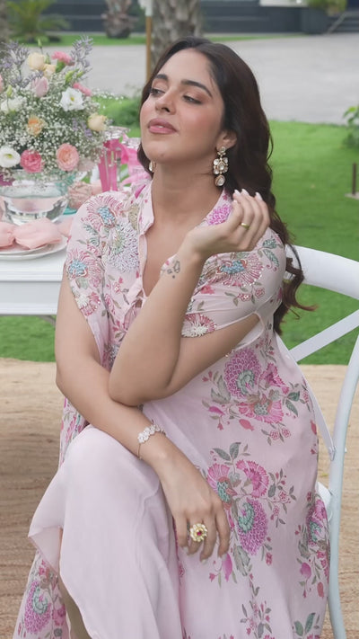 A beautiful Ballet Pink Chinon Silk Cape Set featuring a flowing draped skirt paired with a solid cropped top that includes delicate drawstrings at the neckline. The set is crowned by an exquisite sheer cape covered in a vibrant all-over floral print.