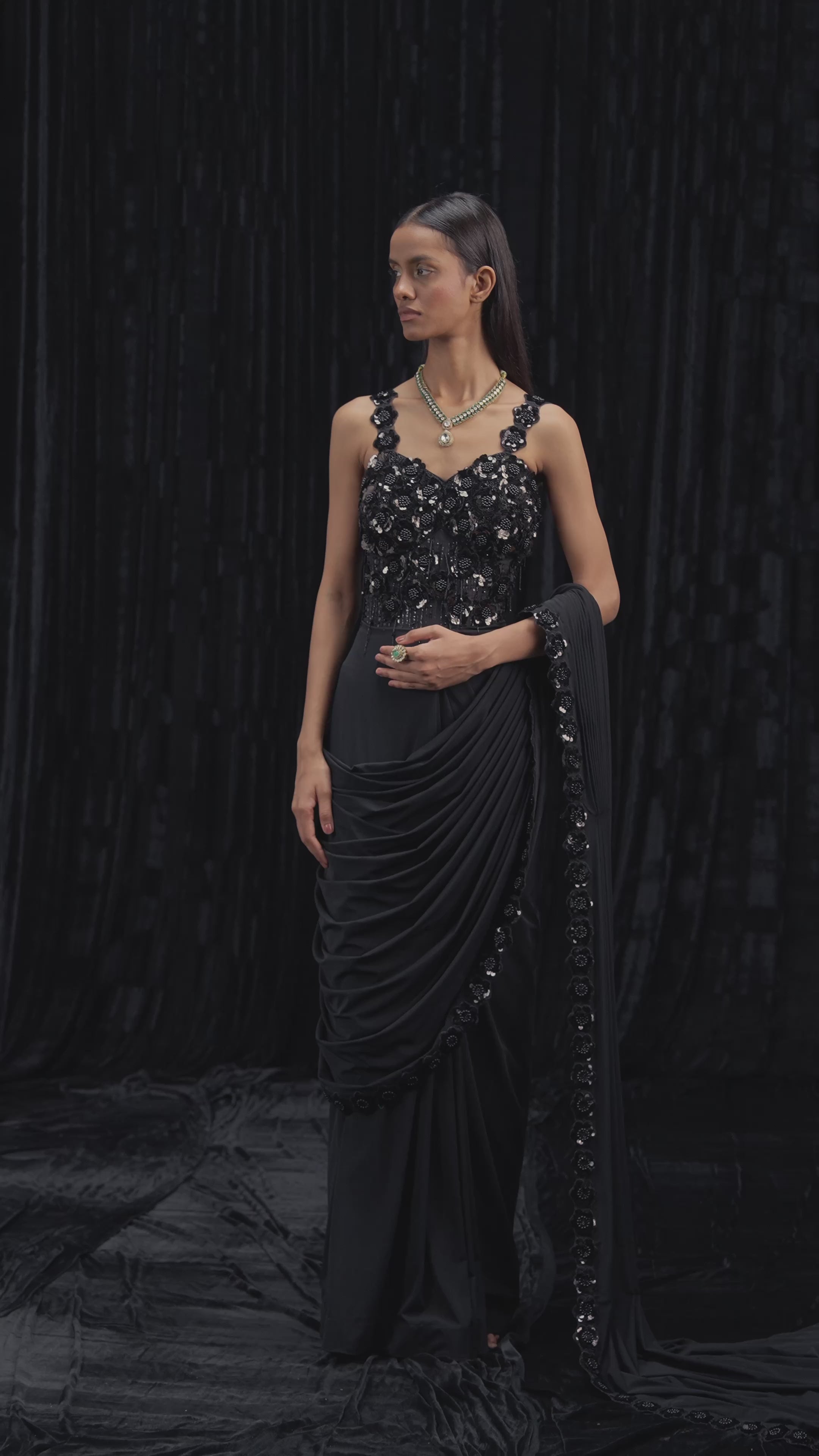 Make a statement in timeless black – a perfect fusion of modern draping and intricate handwork that captures every gaze.
