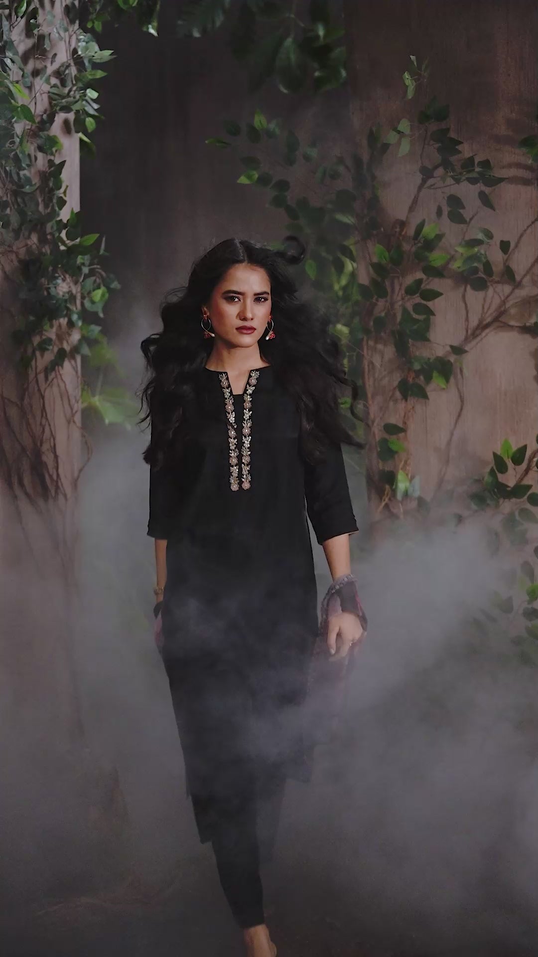 Embrace timeless elegance and artistic flair in this stunning Classic Black Pant Set. This three-piece ensemble features a straight-cut kurta and pant crafted from luxurious premium silk. The kurta's neckline is detailed with intricate floral hand-embroidery, while the look is beautifully contrasted and completed by a flowing dupatta featuring a vibrant, multi-colored Digital Floral Print.