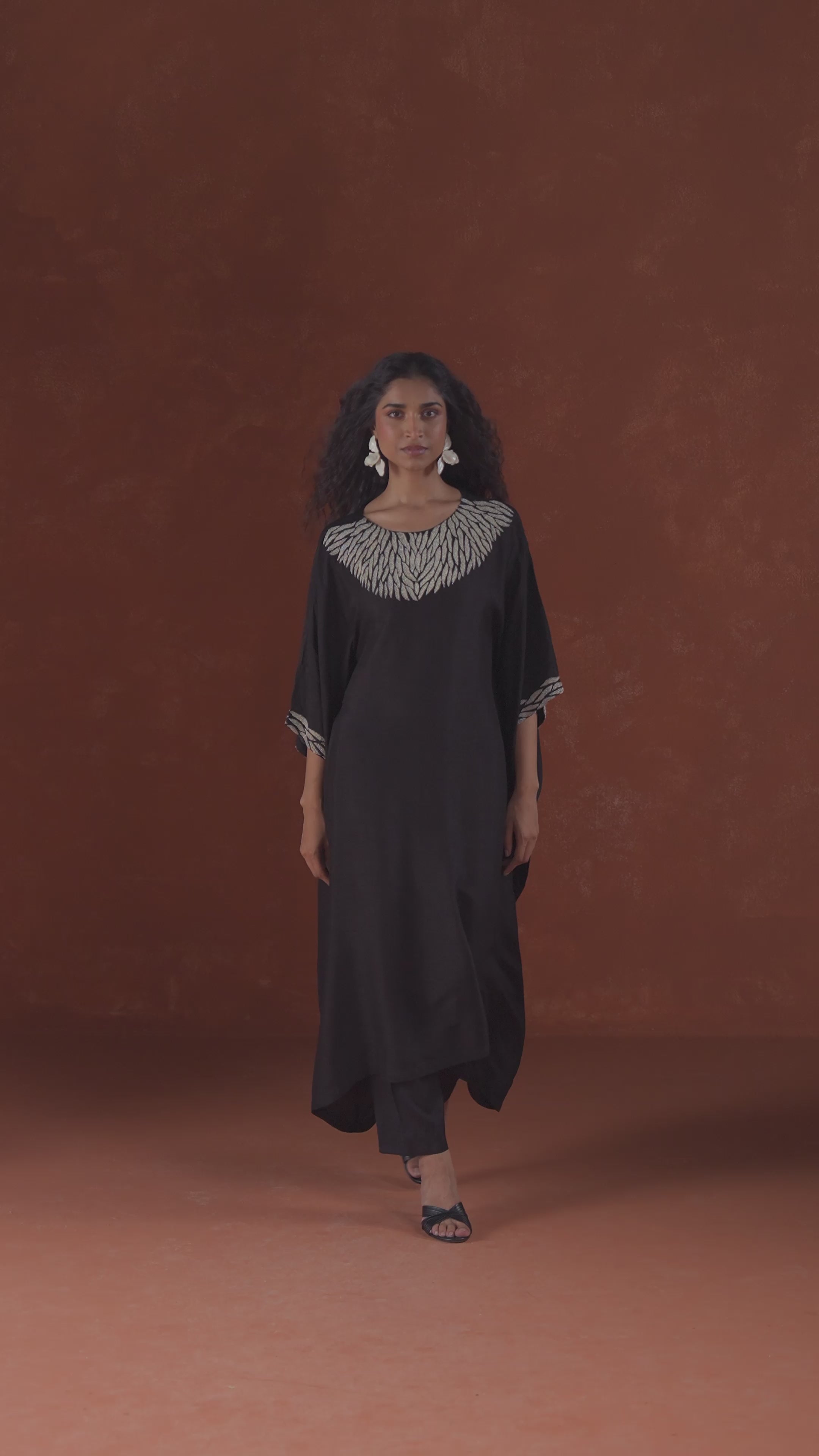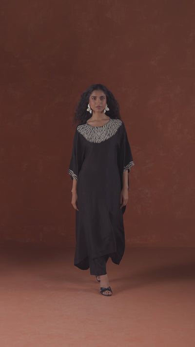 Drape yourself in midnight elegance with this black Embellished Raw Silk Kaftan Set—where fluid form meets intricate handwork in a celebration of timeless style.