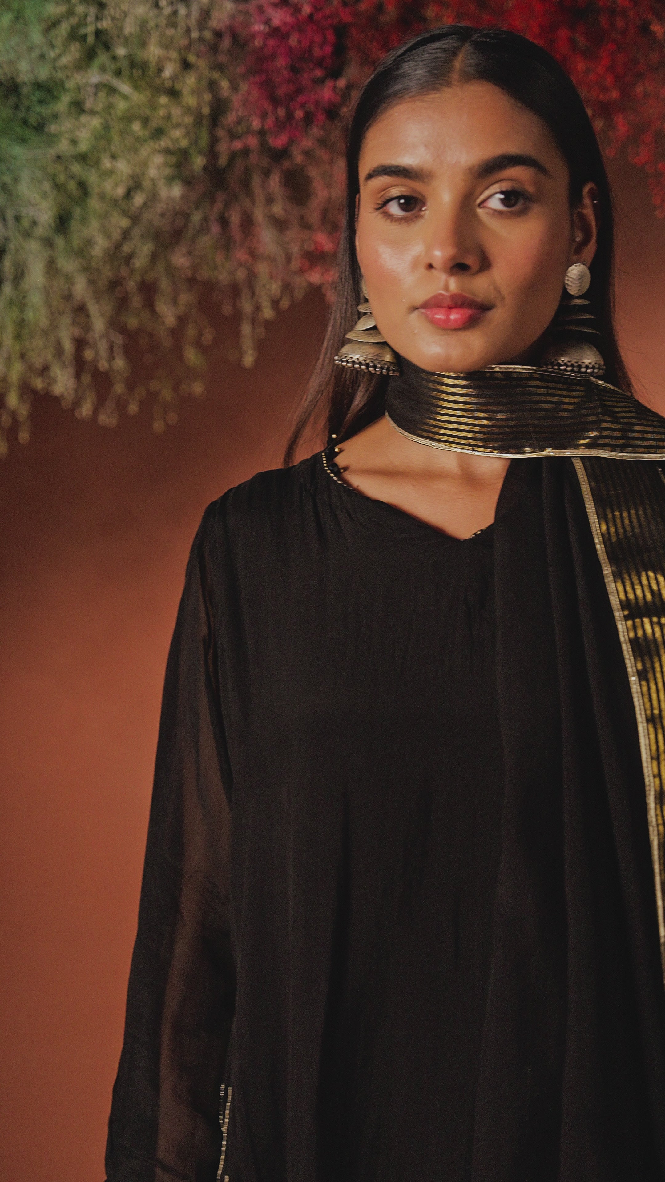 An elegant black ensemble featuring a flowy organza dupatta adorned with gotta lace detailing for a traditional touch. The kurta showcases intricate gotta lace work along the hem, adding a delicate charm. Paired with shimmer organza palazzos, the look is completed with a matching fabric potli—crafted in coordinating shimmer fabric for a cohesive and graceful finish. this look beautifully blends subtle shine with rich craftsmanship—perfect for festive and evening occasions.