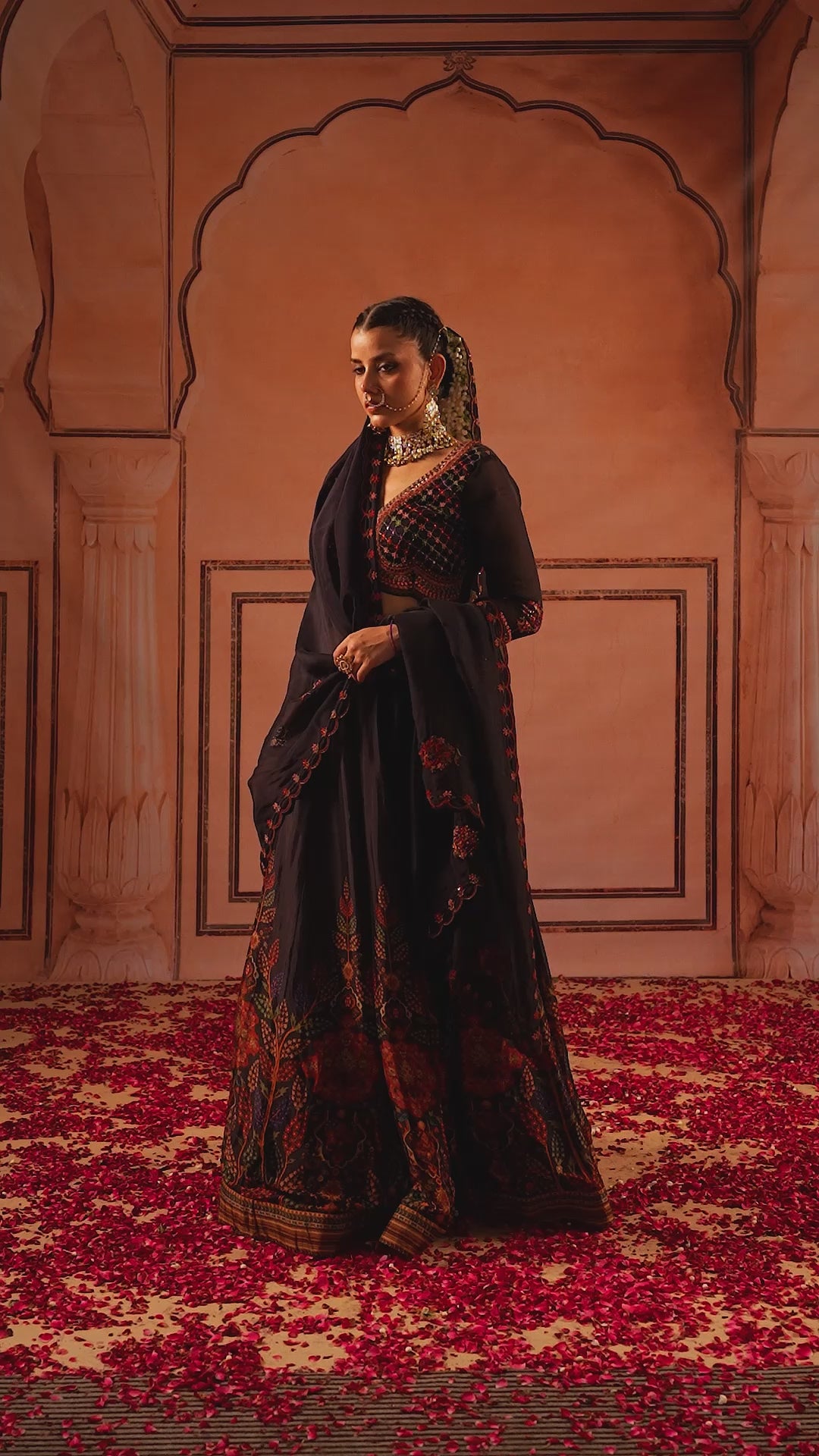 This elegant lehenga set is crafted in soft organdi fabric in classic black, paired with a sheer organza dupatta. The blouse stands out with vibrant multicolored threadwork, intricately embroidered across the front and subtly accented with light sequin highlights, adding just the right touch of shimmer. The skirt features placement prints along the hem, balanced with minimal thread embroidery, cut dana and fine sequins detailing on the waistband for a refined finish. Completing the look is a plain black organza dupatta, gracefully bordered with delicate floral thread embroidery that adds texture while maintaining a clean, sophisticated aesthetic.