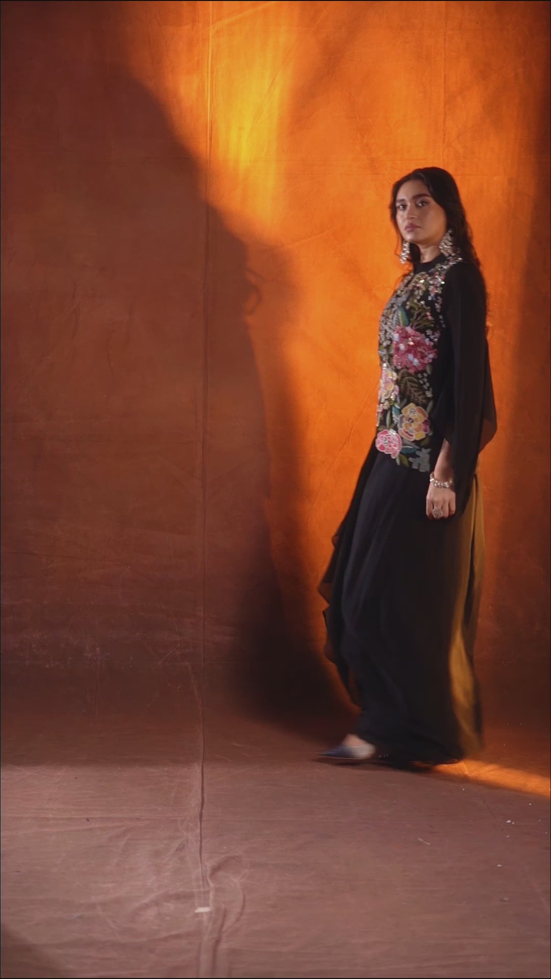 Make a dramatic and elegant statement in this striking Classic Black Skirt Set. This two-piece ensemble features a fluid crepe silk draped skirt and a georgette silk top with dramatic bell sleeves. The bodice of the top is completely covered in rich, multi-colored floral hand-embroidery, showcasing meticulous work with cut dana, beads, and sequins.
