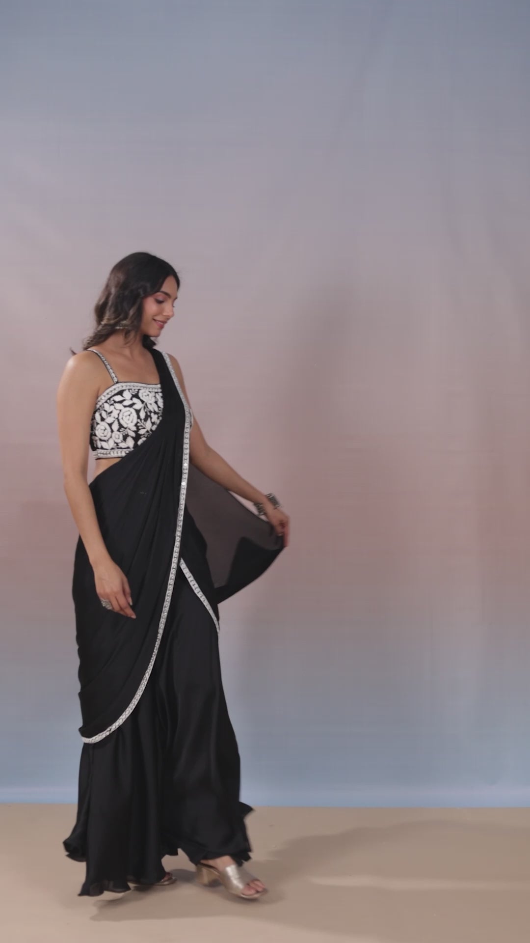 Black floral embroidered premium chinon silk crop top. Embellished with mirror and thread hand work. Paired with matching draped saree. Apt for semi formal wear.