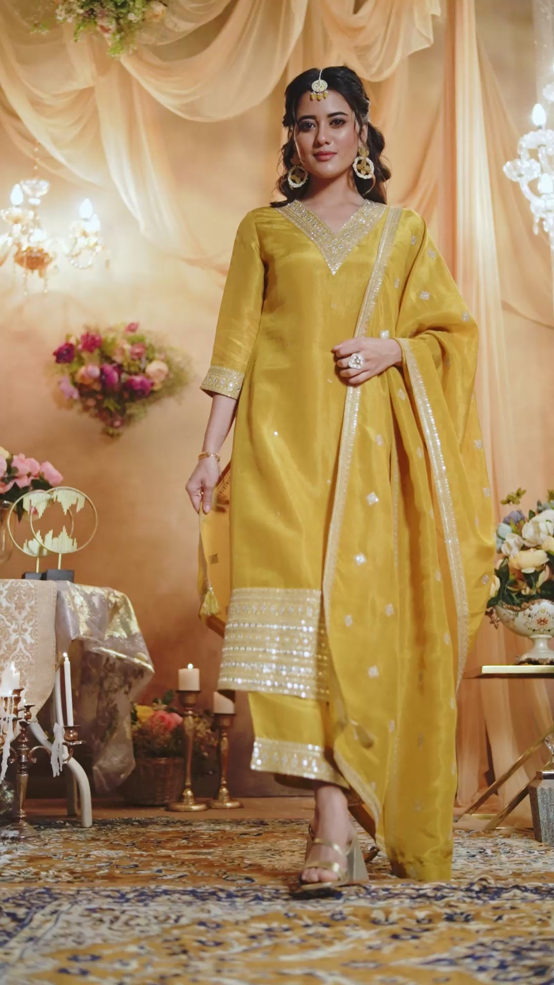 Step into elegance with our yellow embellished tissue organza silk kurta pants set. The kurta is adorned with zari, aari tari and mirror work in front which gives an elegant look. Paired with matching solid premium silk pants and an embellished brocade silk dupatta with tassels on border. Perfect semi-formal events.