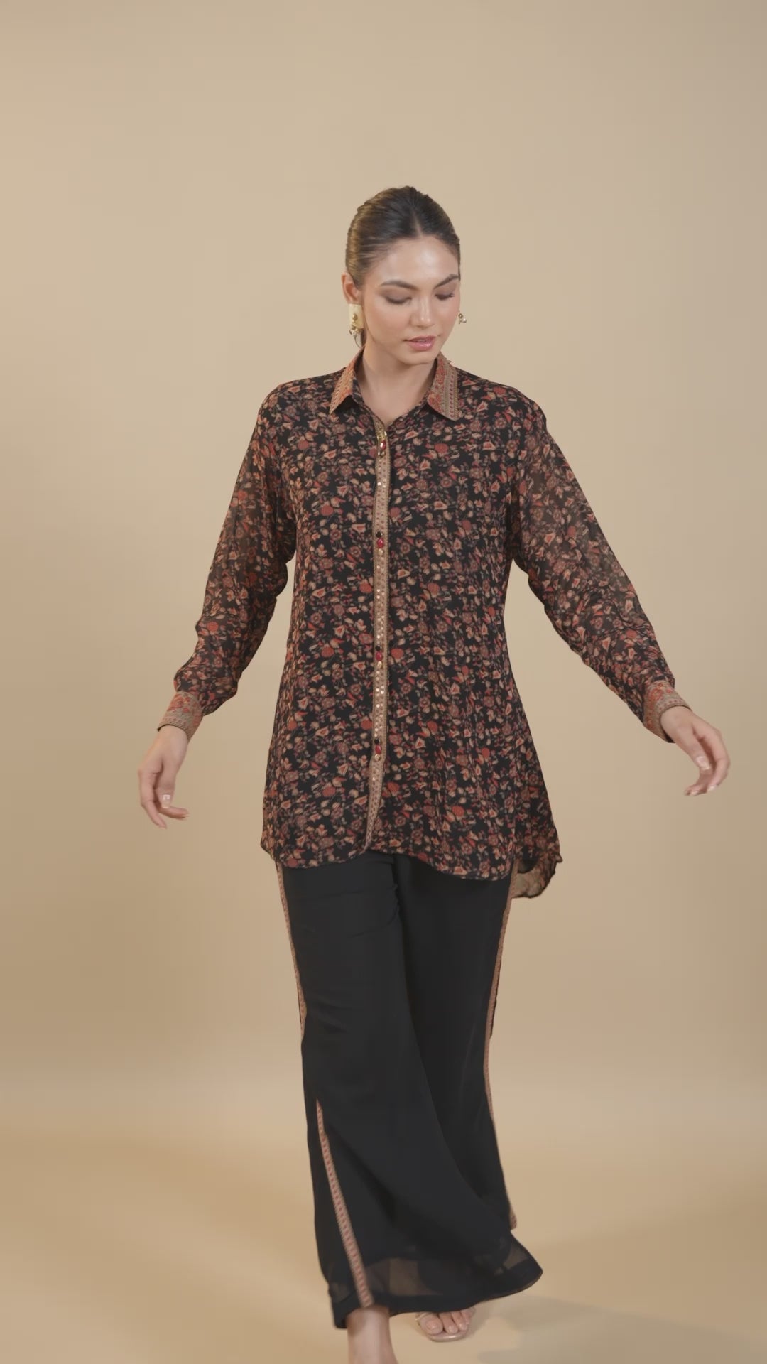 Black traditional printed premium georgette silk high-low shirt tunic, with an attached lining. Crafted with sequin and bead handwork embroidery. Paired with matching solid flared pants. Apt for semi formal wear.